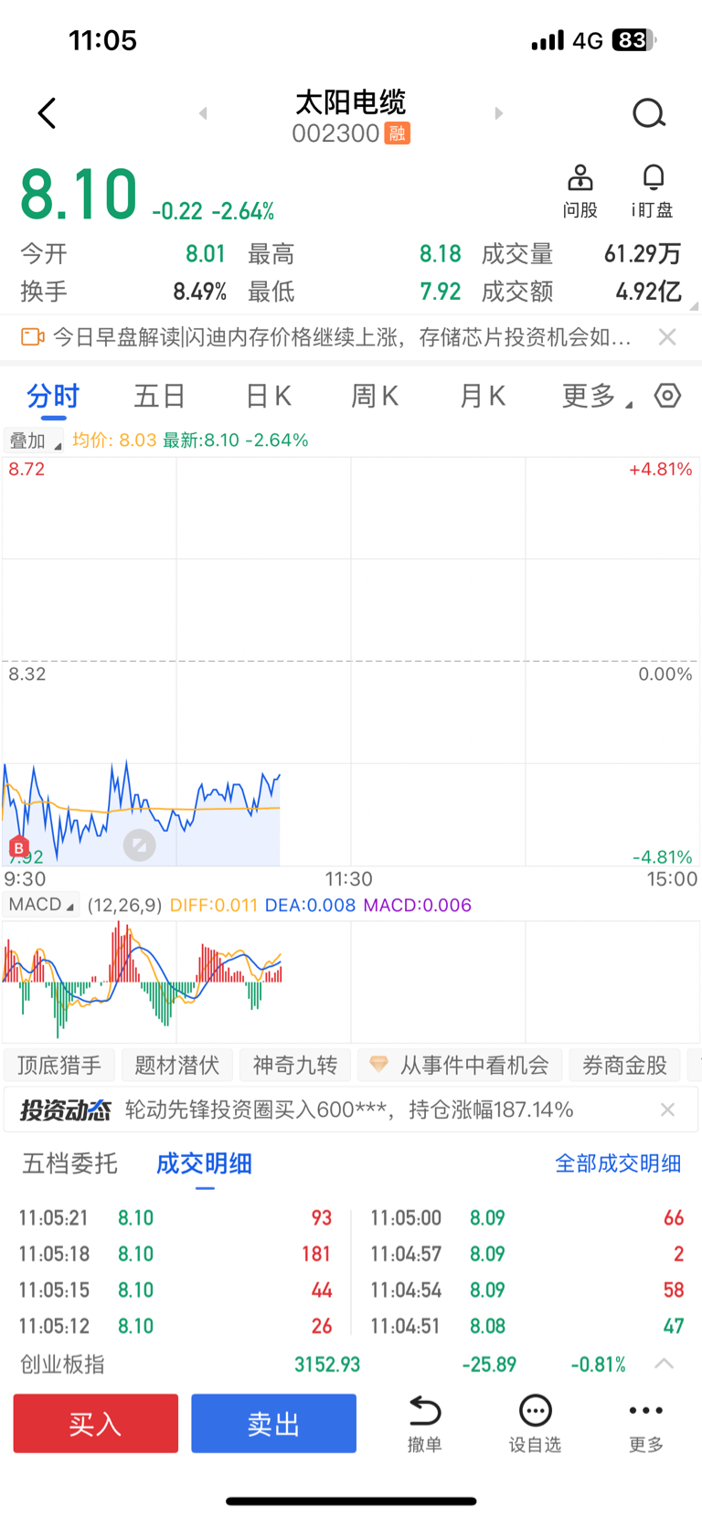 $太阳电缆(SZ002300)$ 7.94加仓的