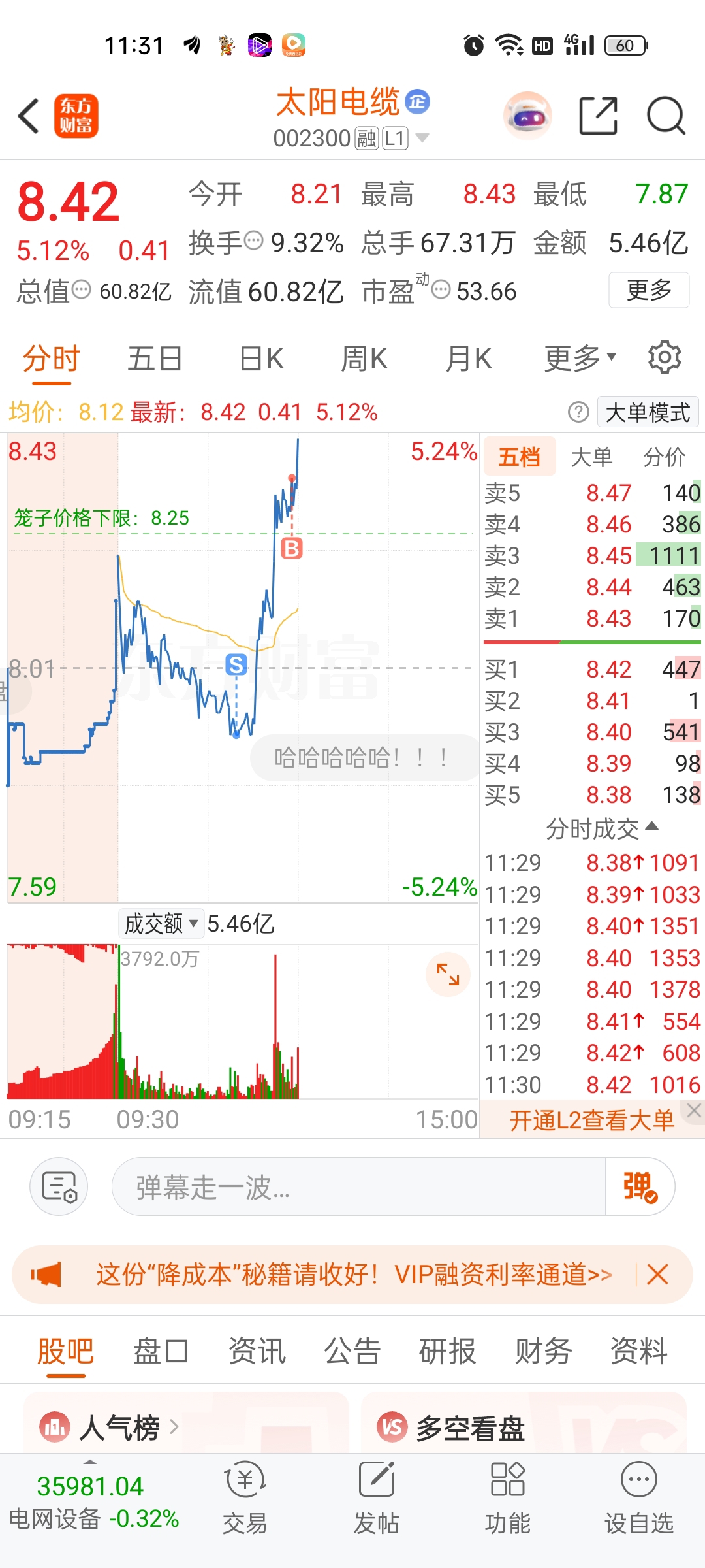 $太阳电缆(SZ002300)$ 为什么我就是做不到格局到尾盘,埋单8.42成交的,