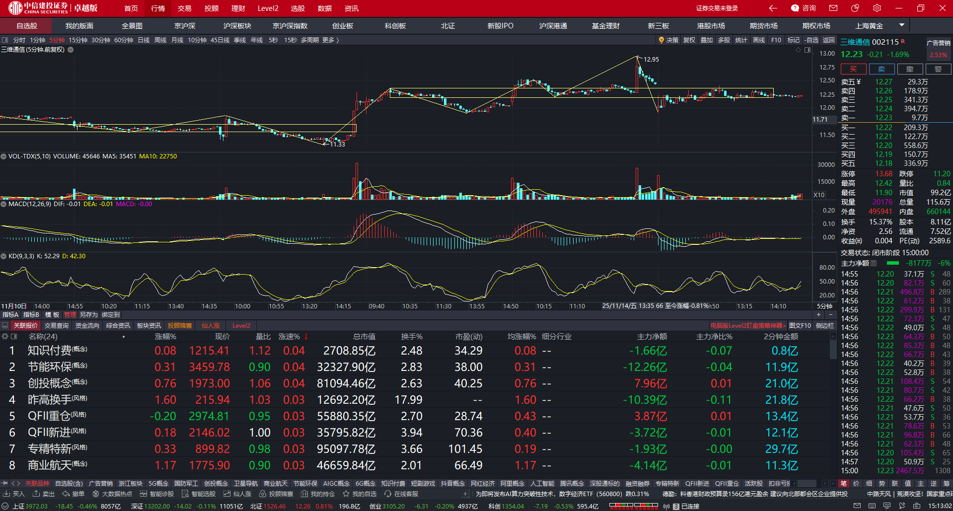 那么今天是缩量洗盘的一天 除了早盘恐慌盘涌出跌破了上周五形成的奔腾中枢外 今天其实大部分时间都在12.21到12.38之间震荡 那么这里明天是有机会一笔拉出12.38的 因为三十分钟已经可以准备构建一个新的中枢了 30分钟的kd已经修复的差不多了 所以明天对于股价的预判是修复行情 明天大概率会突破12.38 去走三十分钟的一笔上 至于这次的力度如何我没办法给准确的点位了 只能通过量能来判断是否能突破前高12.98