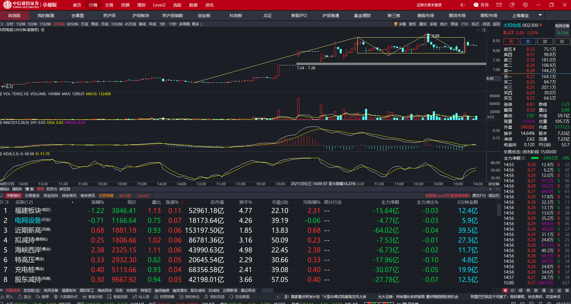 太阳电缆目前三十分钟中枢已经构筑完成 macd也冷却好了 那么明天早上放量的话就可以突破8.65 今天啊最高价8.5 30分钟箱体上沿抛压还是不小的 而且下午拉升的时候明显量能跟不上了 而且今天整天的整体量比对于近期几天而言还是没能放出量来 只比周五微微放出点量来 ,但从侧面也能说明 顶上的抛压并没有特别多 并且缩量同时也能排除庄家出货的嫌疑 目前应该还是锁仓洗盘吸筹阶段 ,那么明天早上有俩个应对方案 如果明天回踩不破8.25 那么股价短期而言可以看到8.65 甚至突破前高 如果量能足够的话。 如果明天跌破7.92回抽不进来的话 那么这里就形成一个三卖点了 就需要考虑是否止损 但我觉得后者概率很小 只是我把可能出现的情况说明一下 你们明天好做应对。