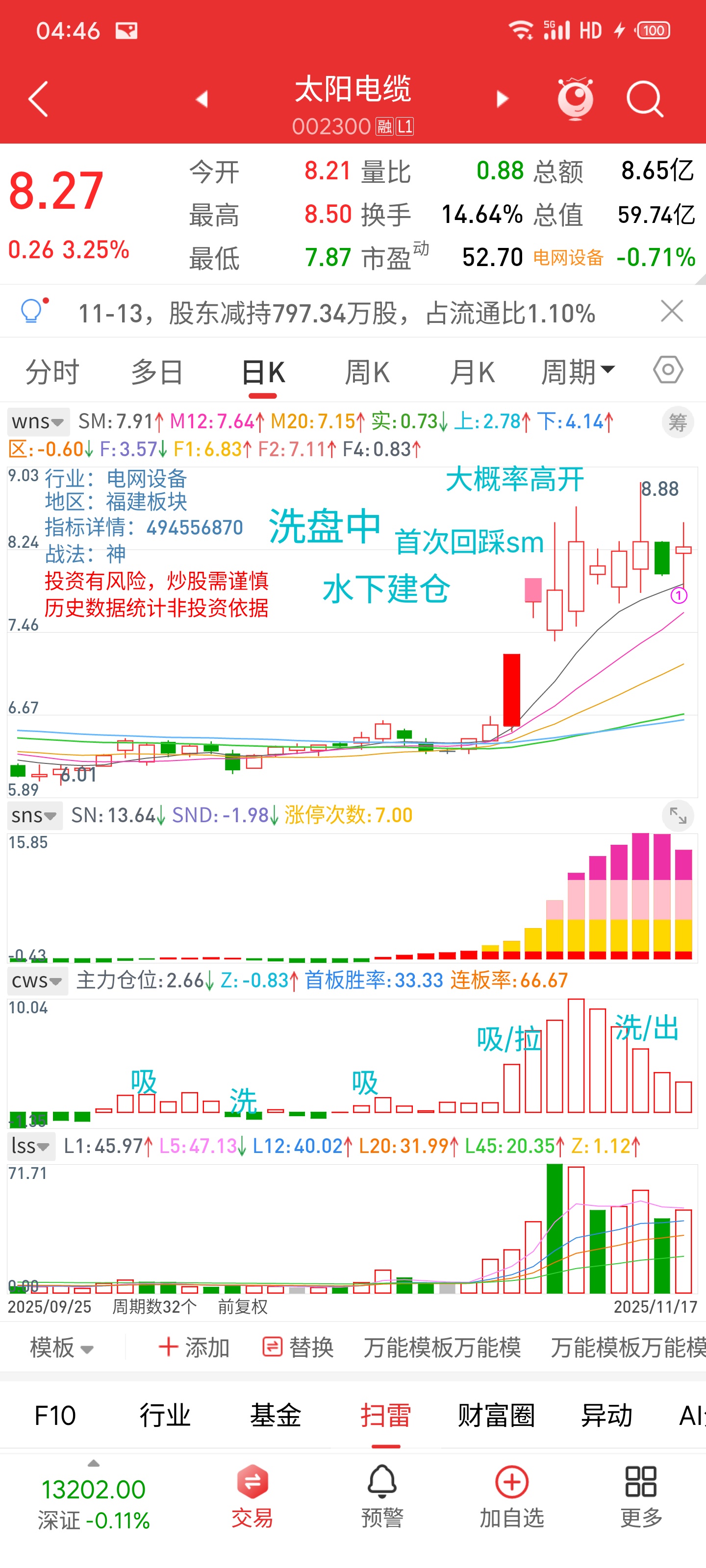 $太阳电缆(SZ002300)$ 一般涨停后第一次回踩sm或m12,如果收十字星或者放量。第二天水下上车,第三天基本都有机会高于回踩那天的收盘价。