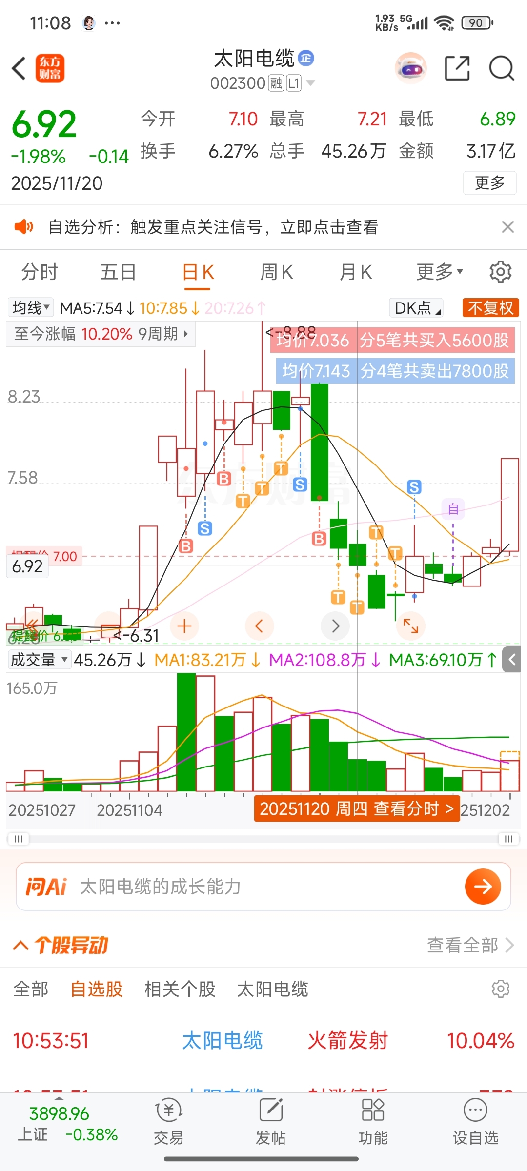 $太阳电缆(SZ002300)$ 赔了几千走的,差不多投了10来万,我走后,开始启动,最后一次卖出后才开始涨的,折磨人啊