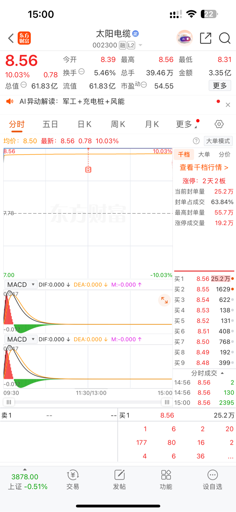 $太阳电缆(SZ002300)$ 你们喊破喉咙也没有用、我是不会卖给你们的、越唱空越惜售、今天继续一字板、逻辑就是这样的、15天以后减持算什么利空、主力不比你们知道的清楚、周一我卖给你们!