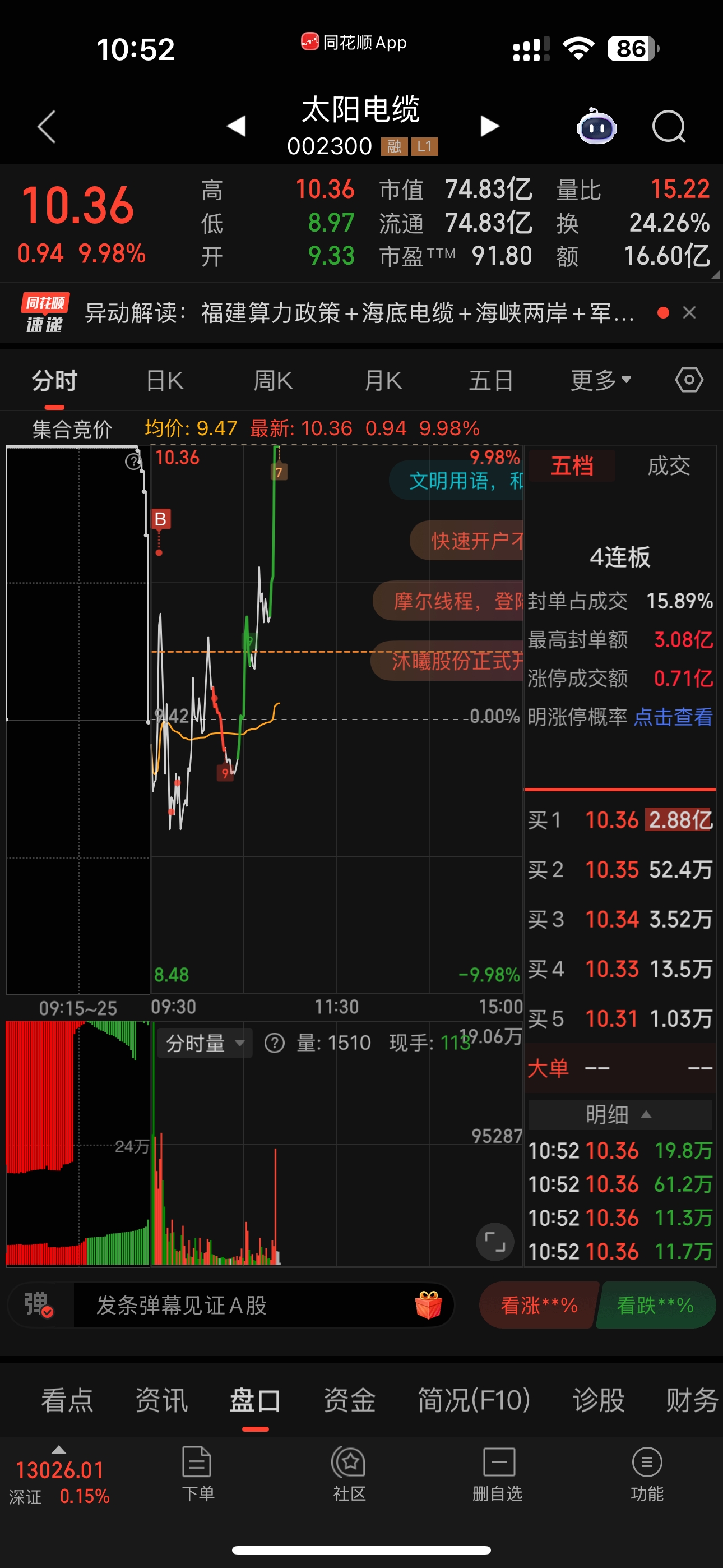$太阳电缆(SZ002300)$ 以为买在了山顶
