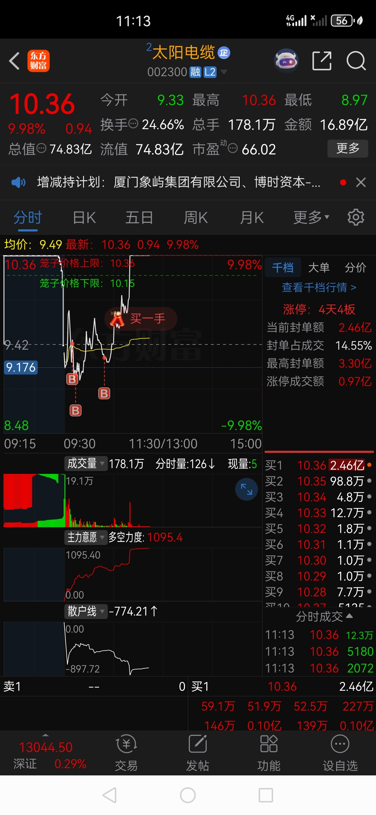 $太阳电缆(SZ002300)$ 水下2个点买的,可惜没把闽东电力卖了买特发信息,特发信息被昨天洗出来了,跟航天发展一样的走势,估计明天买不到了