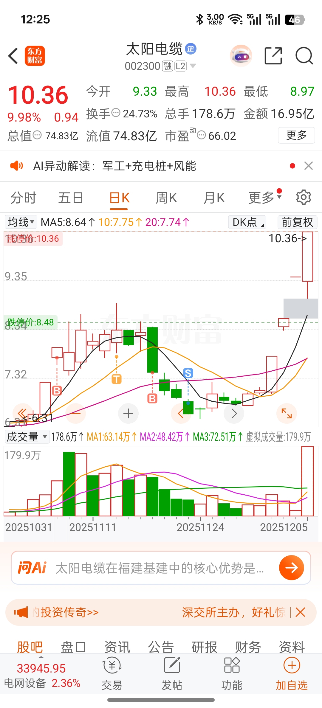 $太阳电缆(SZ002300)$ 当时亏本卖的,少赚两万块钱