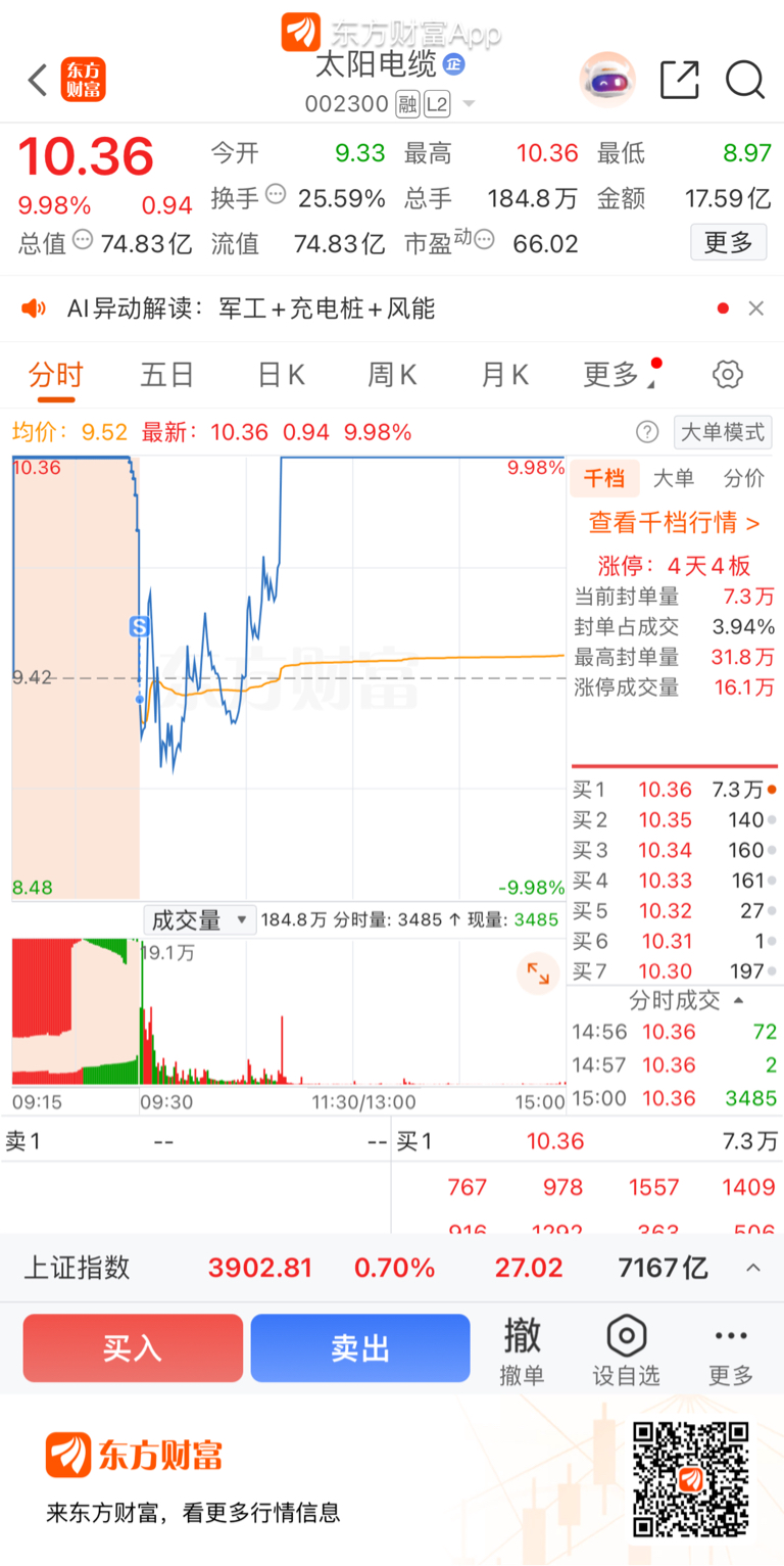 $太阳电缆(SZ002300)$ 该死的减持公告,不然今天拿板稳的,