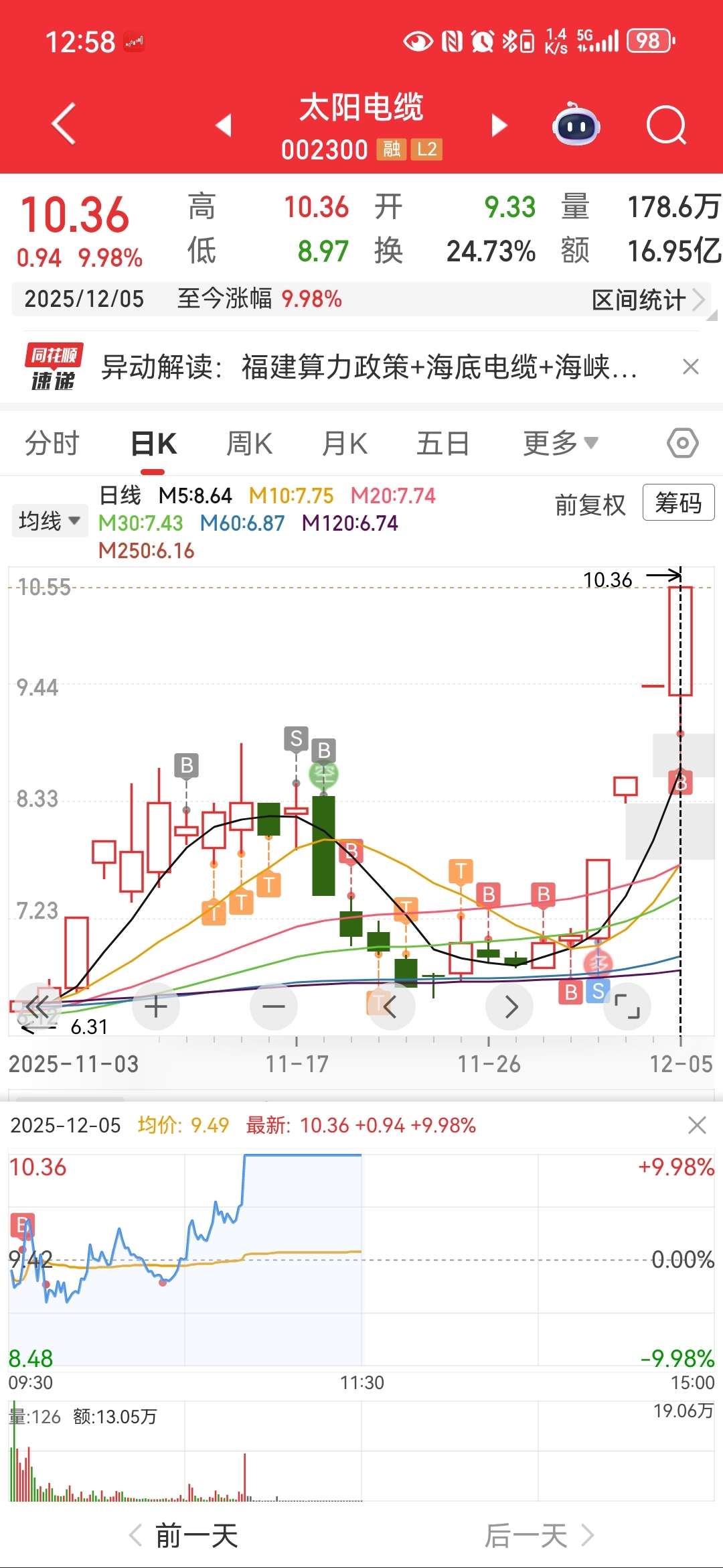 $太阳电缆(SZ002300)$ 今天纠错,卖飞的水下接回来了点