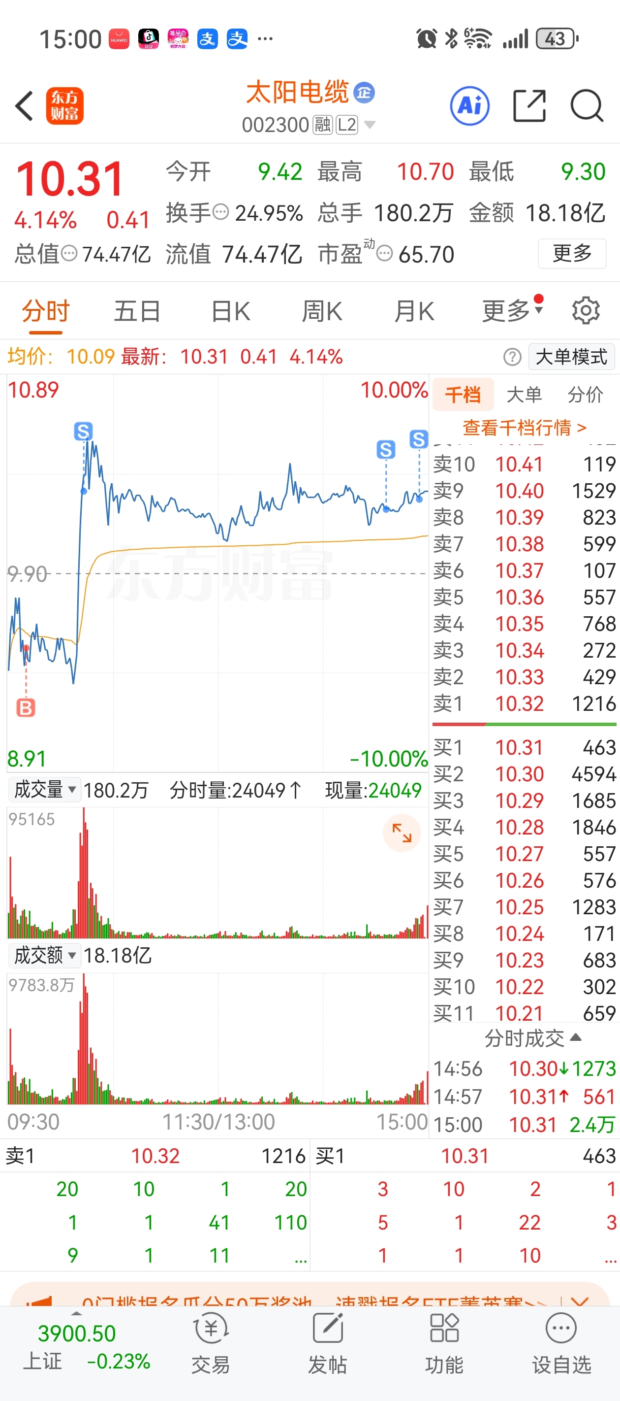$太阳电缆(SZ002300)$ 还以为今天会冲涨停。