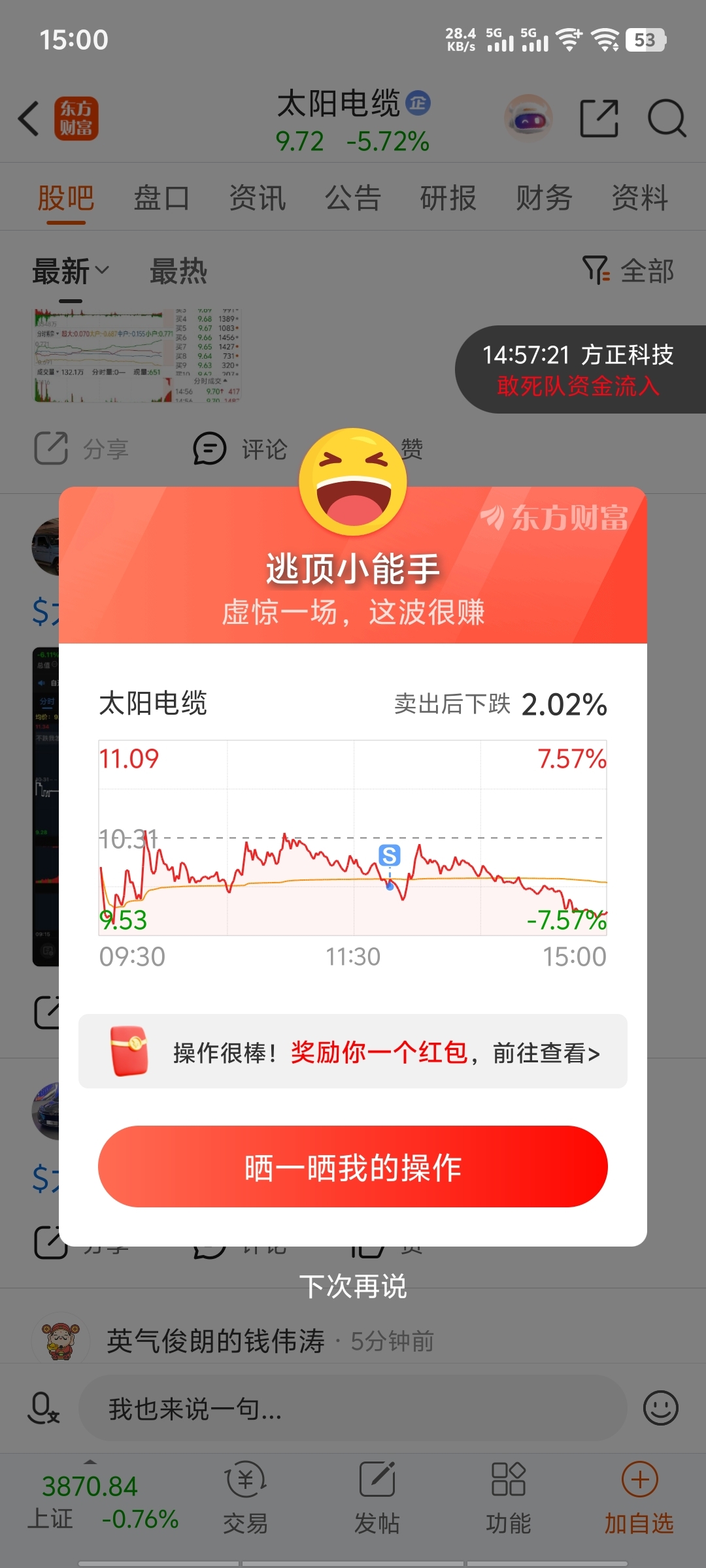 $太阳电缆(SZ002300)$ 真的已经很格局了。拉高的时候我不亏我都没走。想支持一下,后面没办法我就走了还是亏了几百的哎没办法,知行合一说到做到