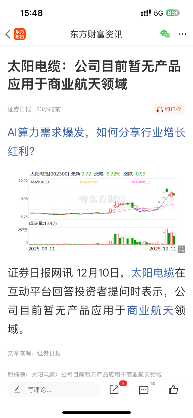 $太阳电缆(SZ002300)$ 今晚会不会接着发这条新闻