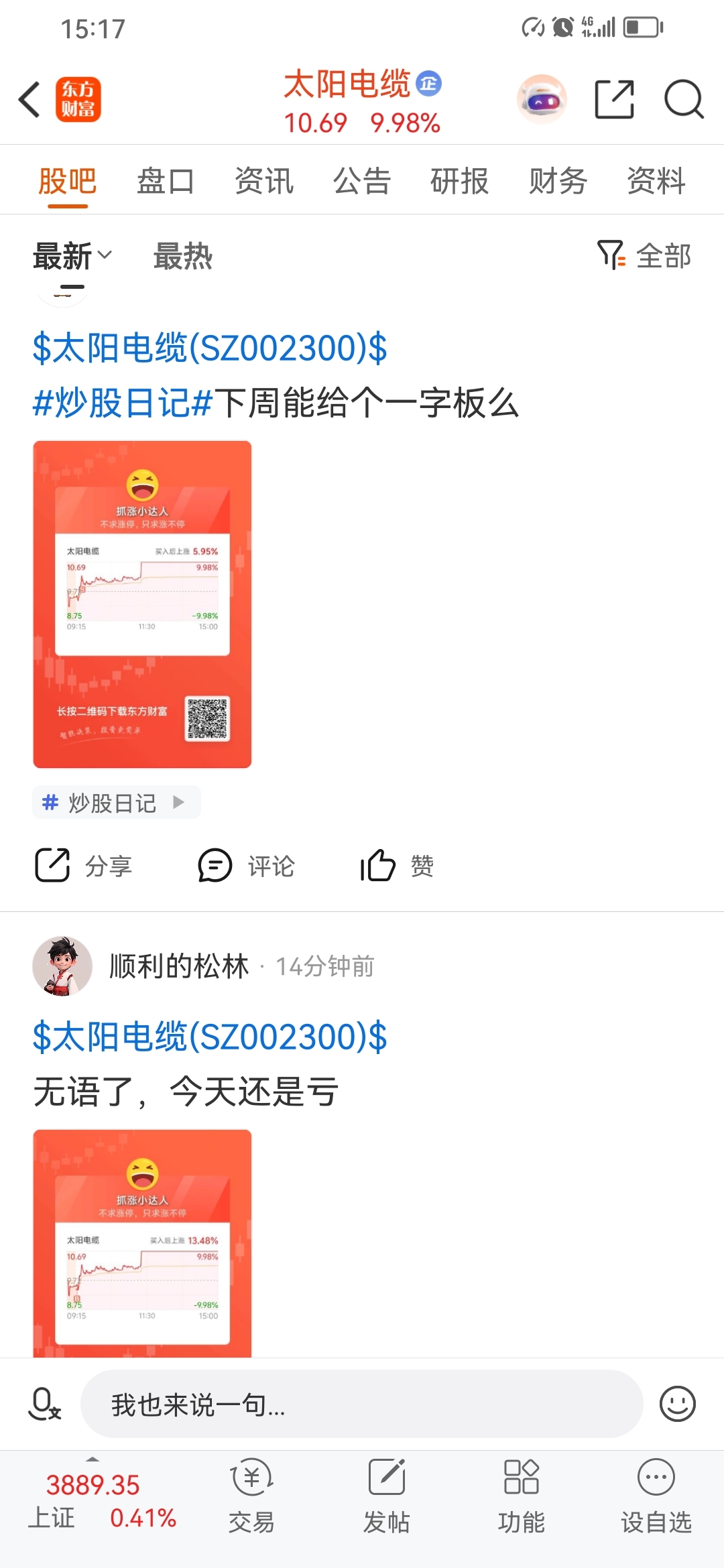 $太阳电缆(SZ002300)$ 刚收盘这来这么多晒单沟服了