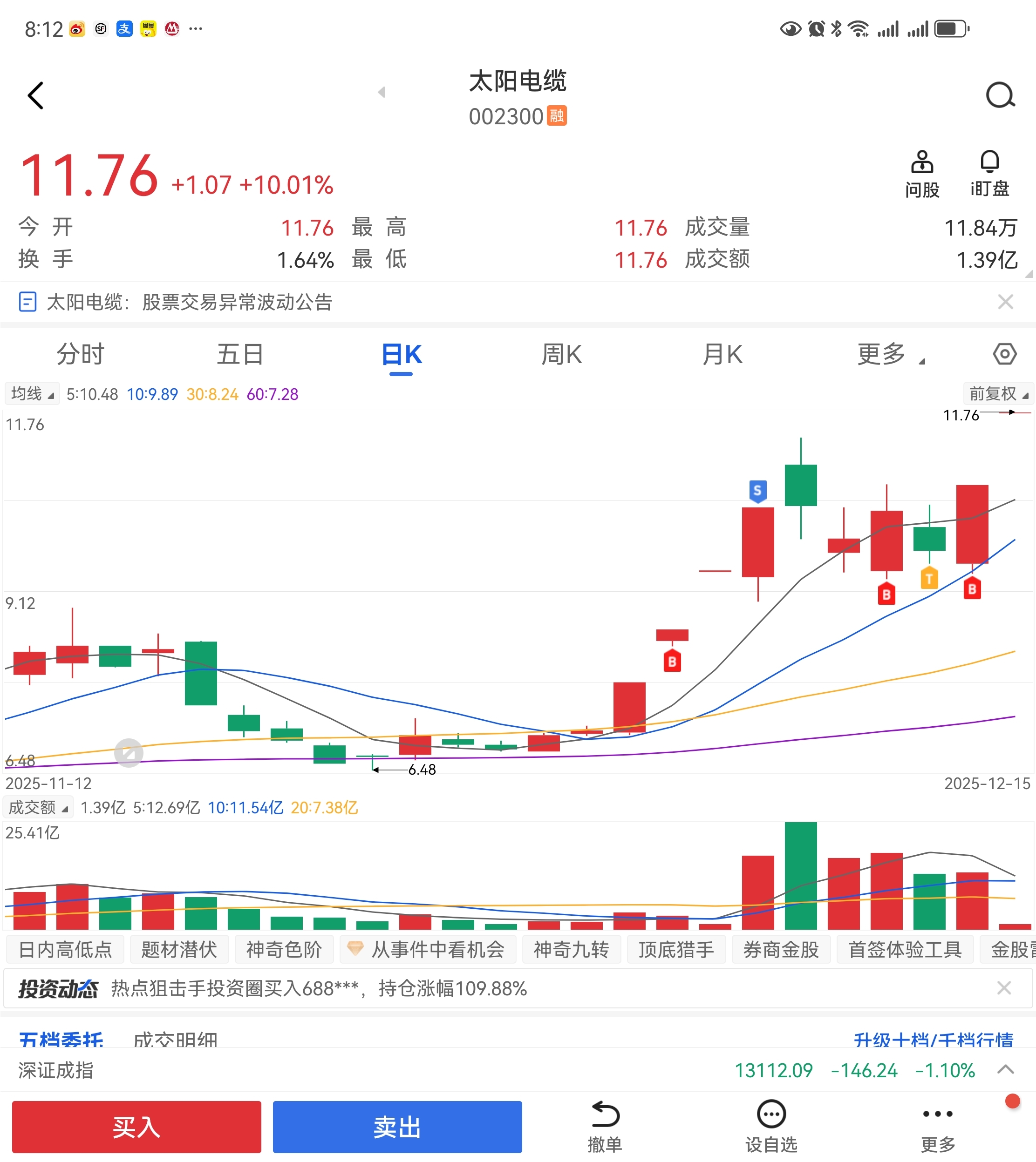 $太阳电缆(SZ002300)$ 这波去到20以上,跟群总起飞。