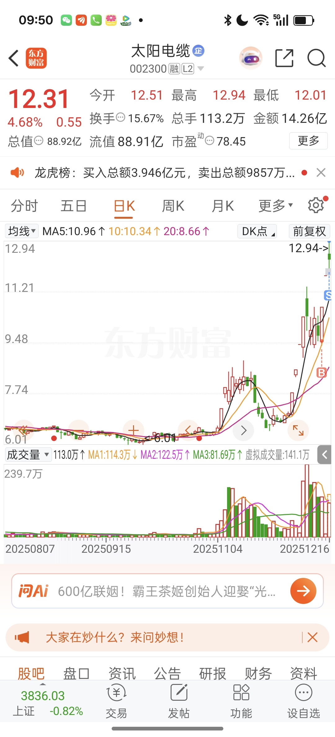 $太阳电缆(SZ002300)$ 感谢,吃了三个板,祝越来越好,