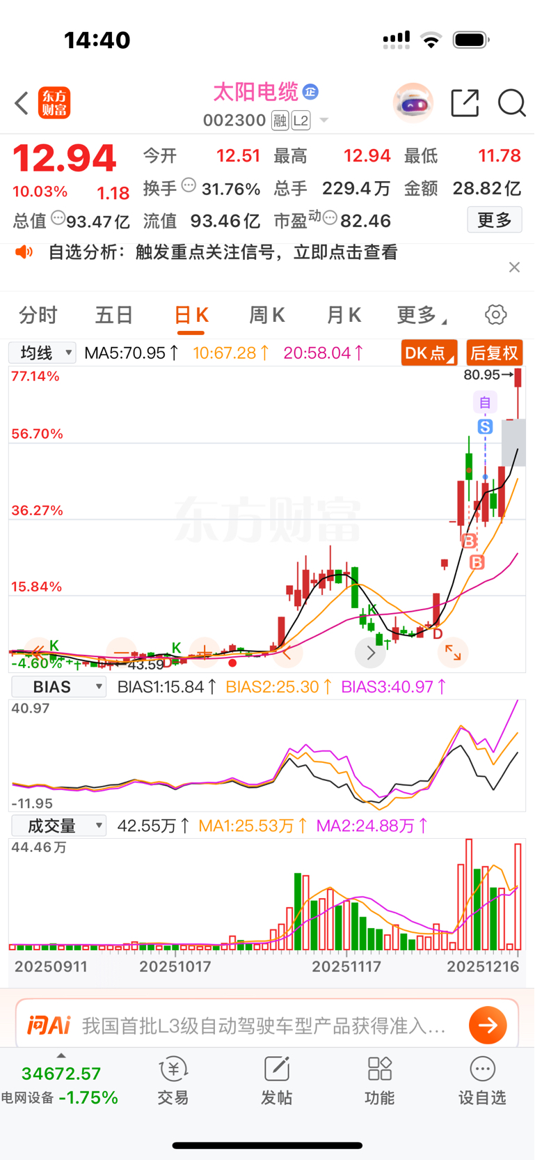 $太阳电缆(SZ002300)$ 我真的……妈的