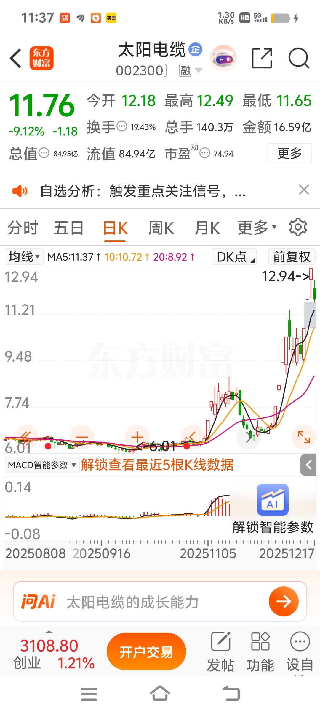 $太阳电缆(SZ002300)$ 杀高标股,已破位