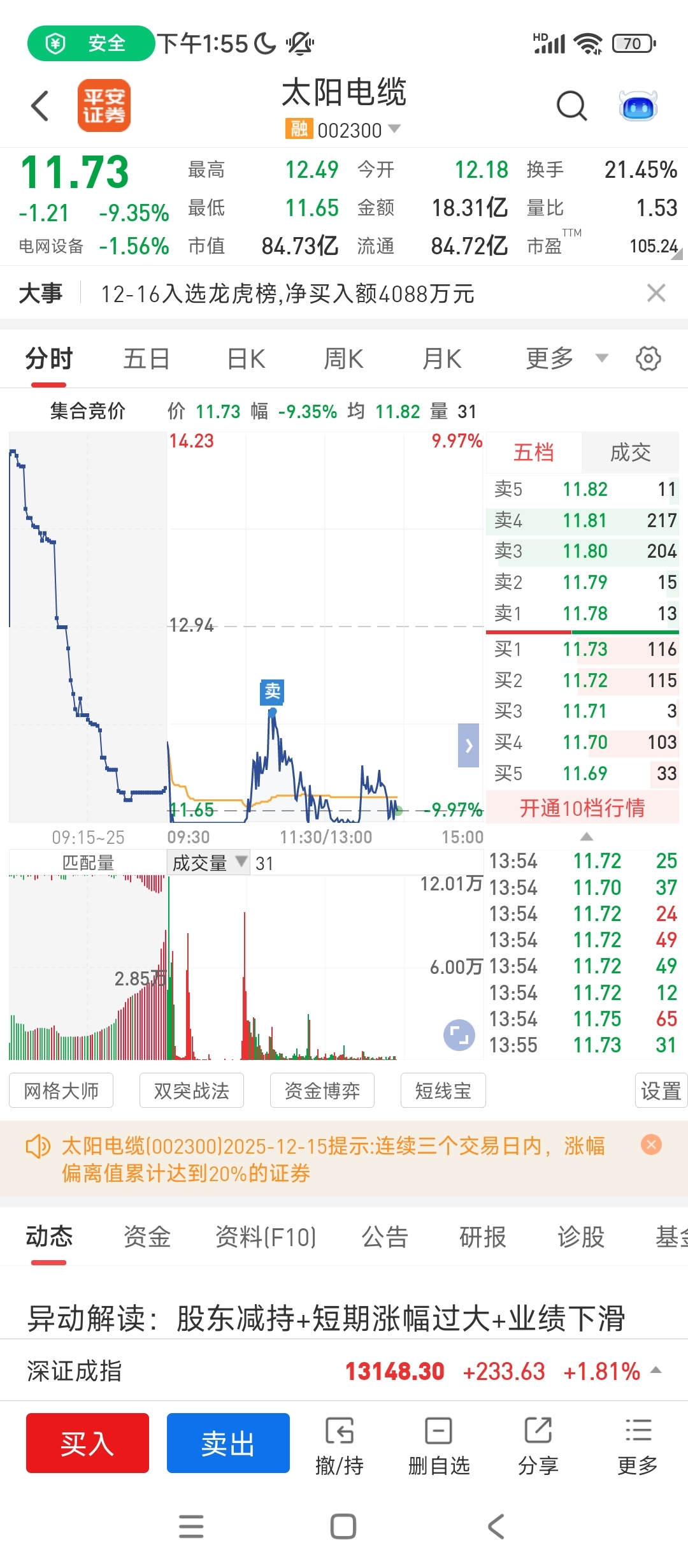 $太阳电缆(SZ002300)$ 最近市场是怎么了,太恶劣了...昨天的烂板回封,今天最好的预期应该是高开弱转强是最好的,结果直接深水炸弹,应该直接竞价卖的....小小心思期待下奇迹?格局了一下没有竞价卖,盘中反核突破开盘新高又注入一丝希望,结果走得这么恶心,没办法,只能出局了。。。