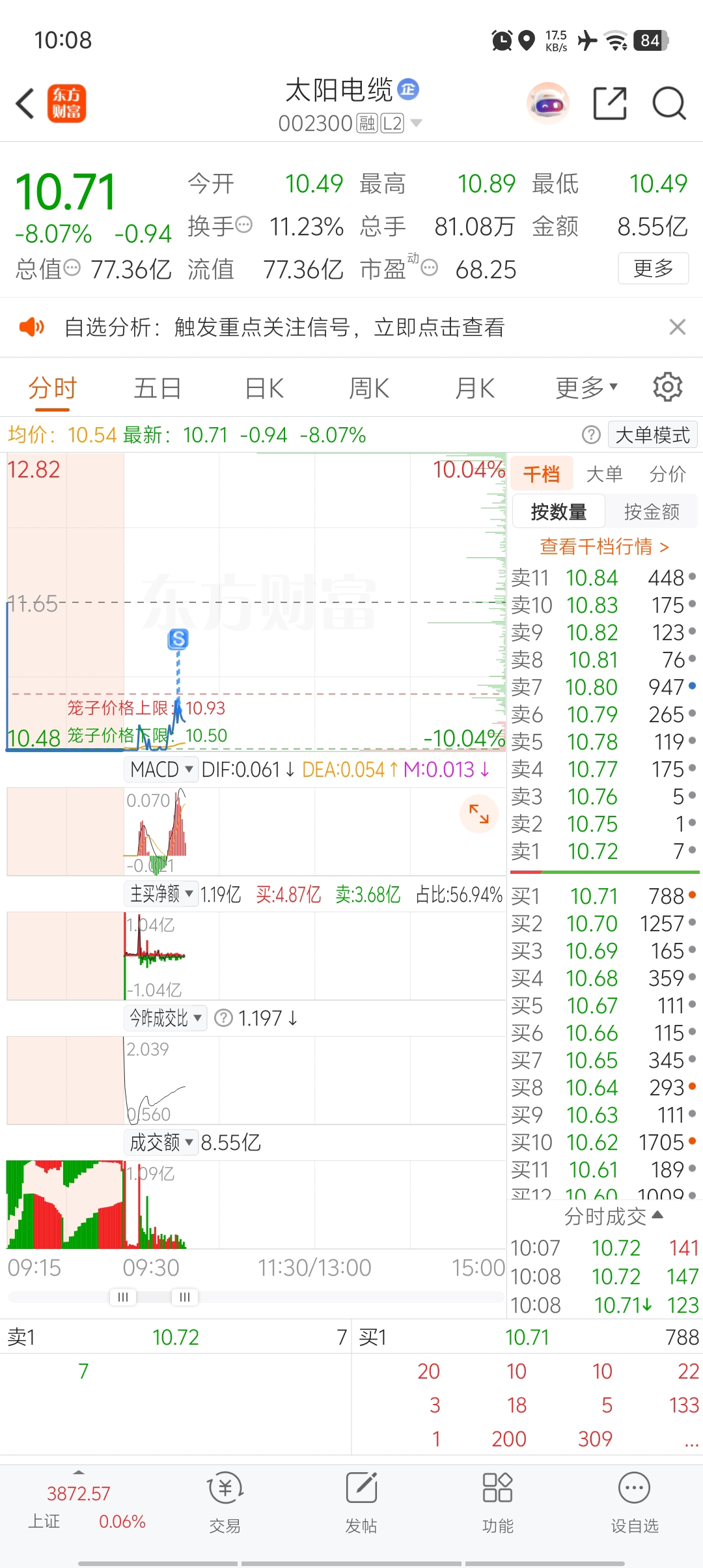 $太阳电缆(SZ002300)$ 半小时了 没有翻红 纪律做错就要承认 今天大概率还是跌停