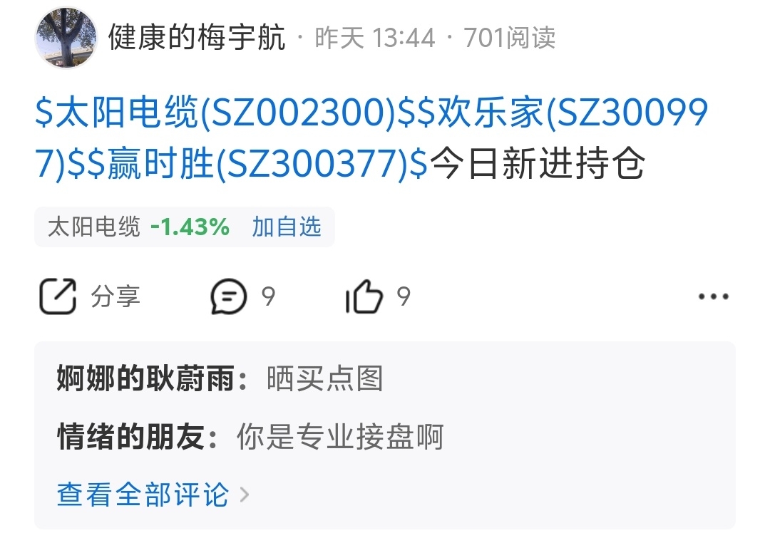 $太阳电缆(SZ002300)$ $赢时胜(SZ300377)$ $欢乐家(SZ300997)$ 昨天的票还是比较对得起大家的吧