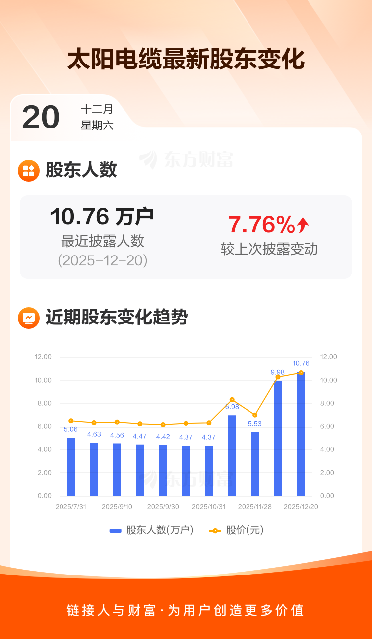 太阳电缆:截至12月20日最新股东户数10.76万户,较上期增加7.76%