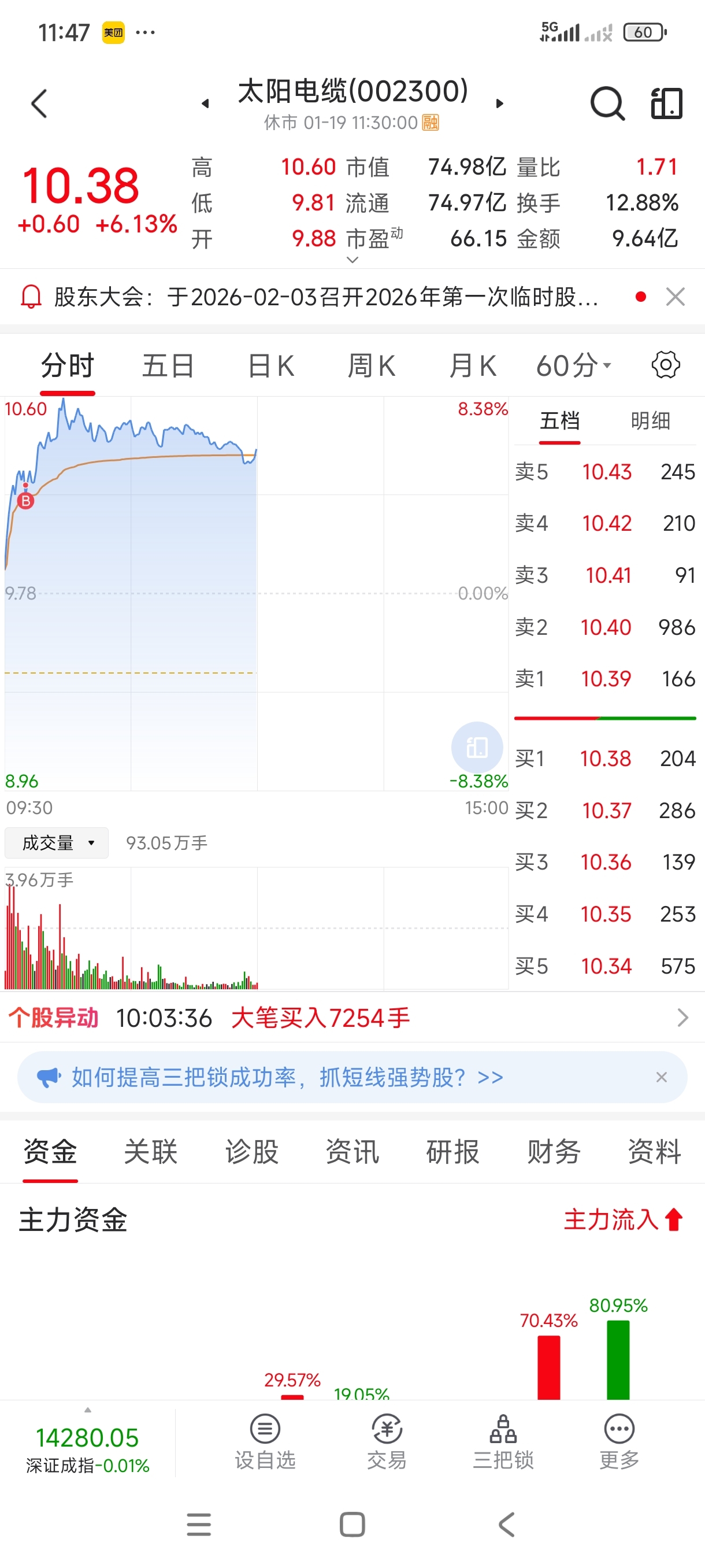 $太阳电缆(SZ002300)$ 从不追高的我,今天冲动了一下,现在又不想格局了,下午开盘就把今天买的卖了,两百三百的也是爱啊