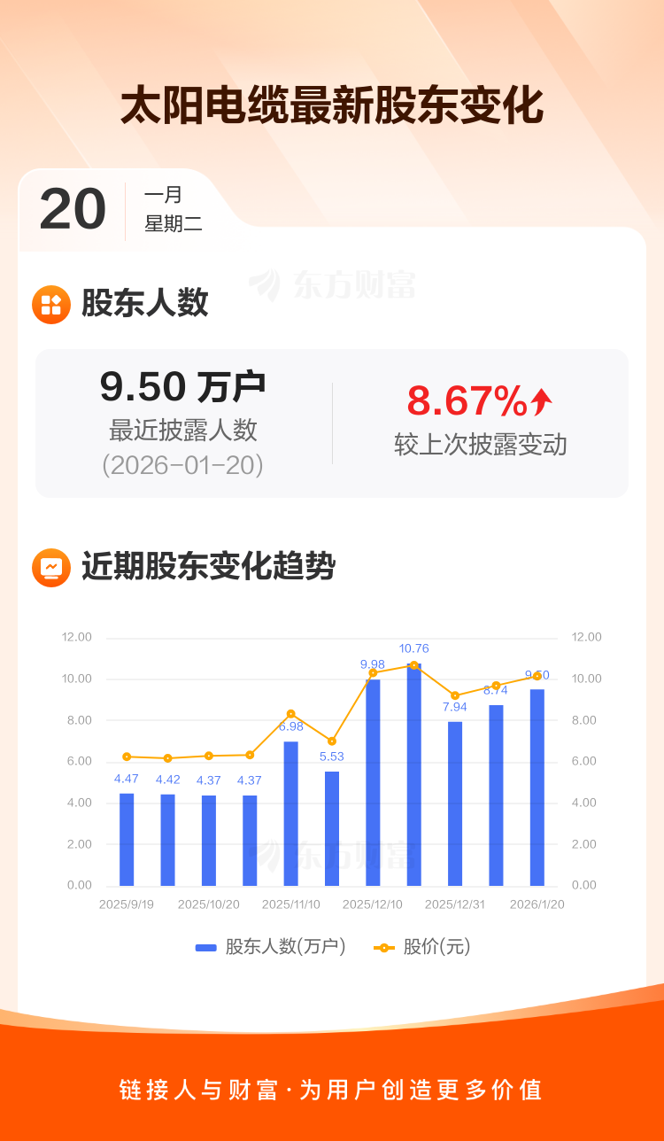 太阳电缆:截至1月20日最新股东户数9.50万户,较上期增加8.67%