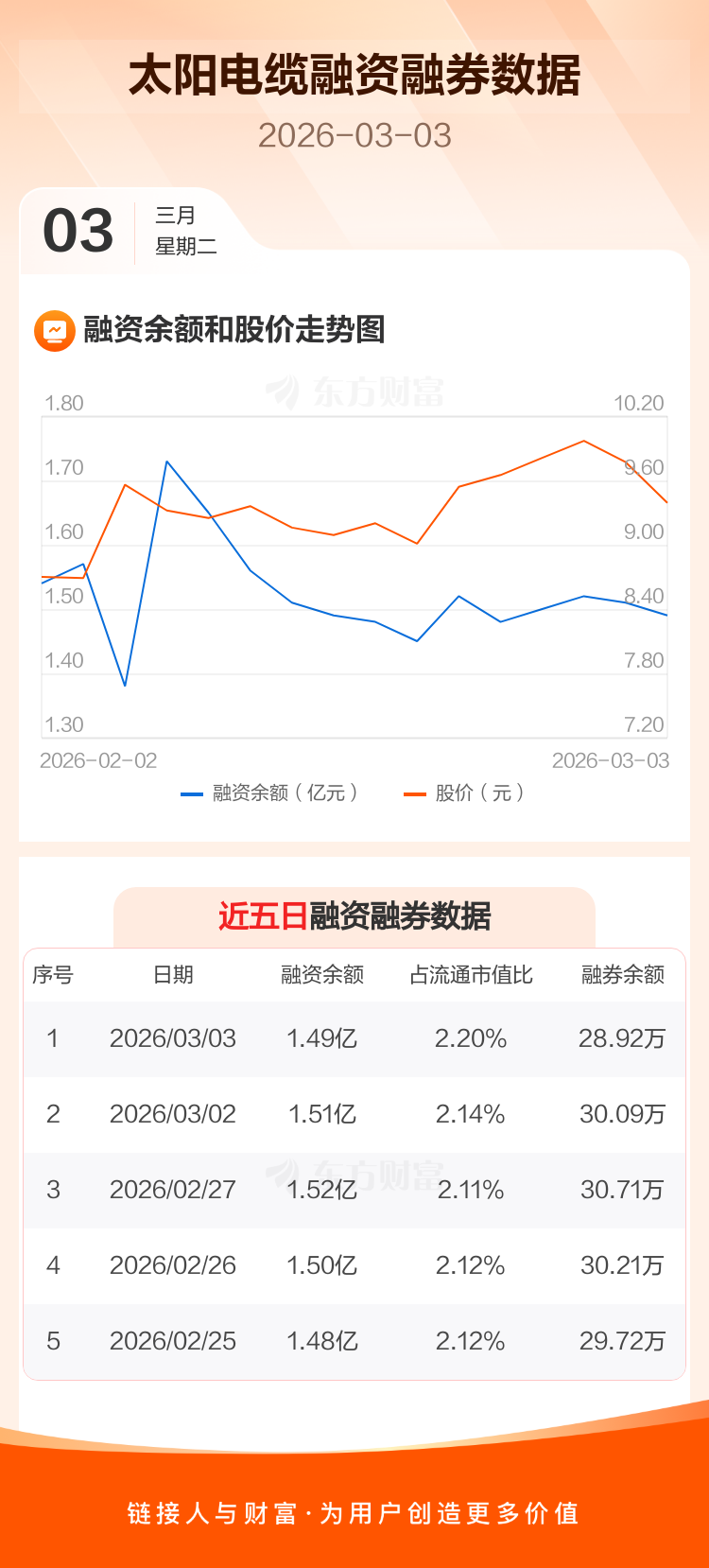 交易所最新数据显示,太阳电缆于2026年3月3日获融资买入2937.37万元,融资偿还3127.51万元,当日融资净偿还190.14万元。目前,该股融资余额1.49亿,占流通市值比例为2.20%。