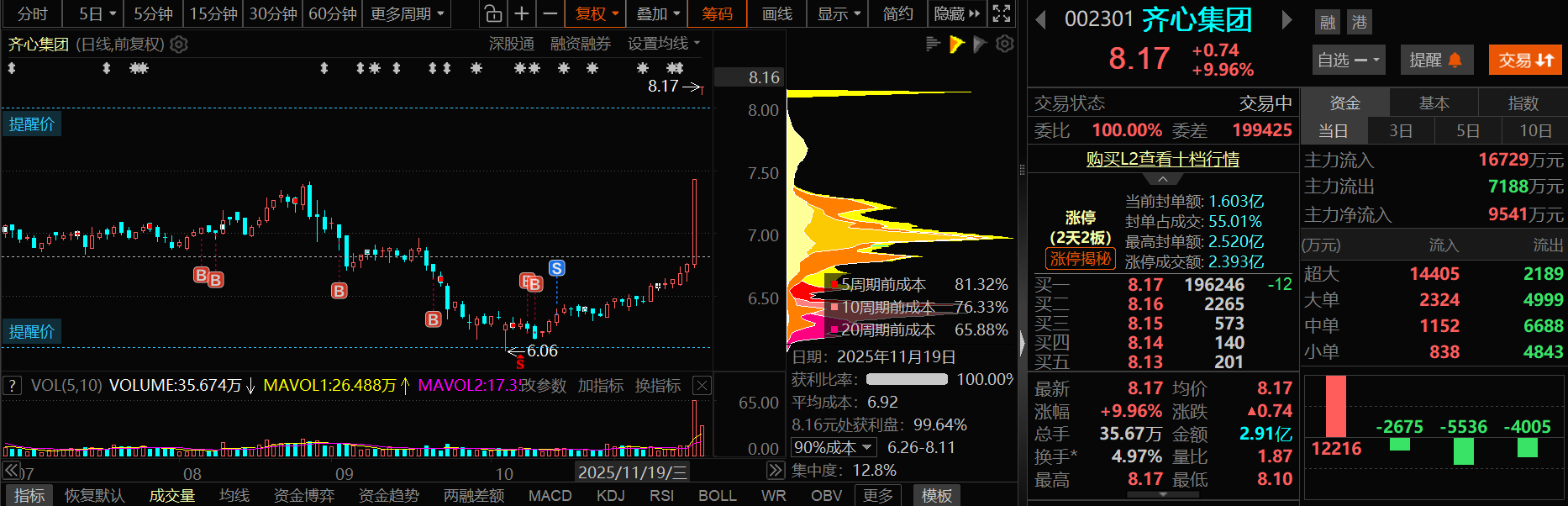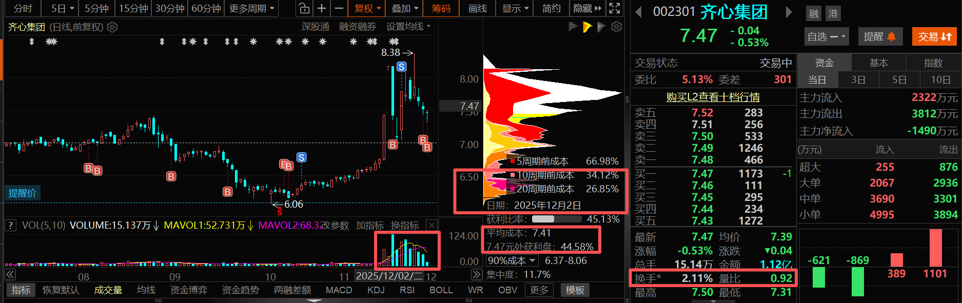 2025-8-5开始建仓7.11,看中的是社保持仓,中间曾涨到7.41,涨幅不到5%,也就没卖,结果开始跌跌不休,间或几次补仓,做低了一些成本,做了一次低吸高抛,又降低了一些成本,看着趋势变好,大部分仓位一直没有卖出,没想到来了2个涨停板,反而赚了20%,相信后面至少还有1个或多个涨停板,主力近2个月的低吸筹码 换手率一直不高,上方也没有套牢筹码,主力不可能出货,那我就跟着喝些汤水吧,主力加油,希望能变成妖股