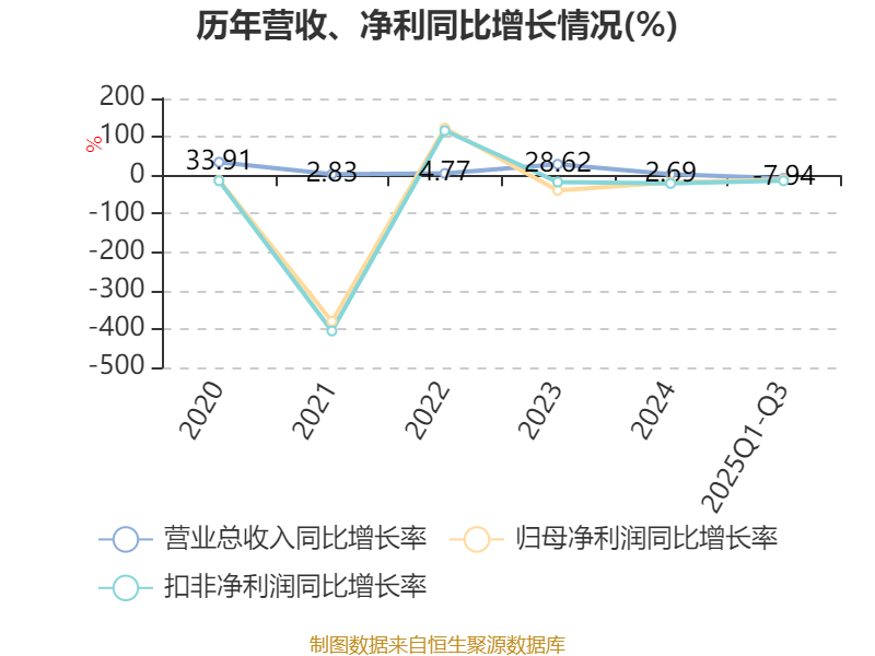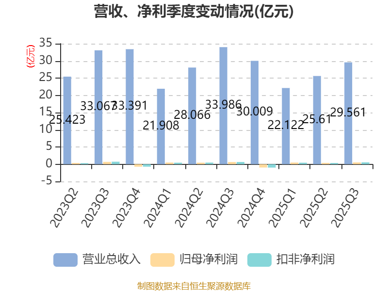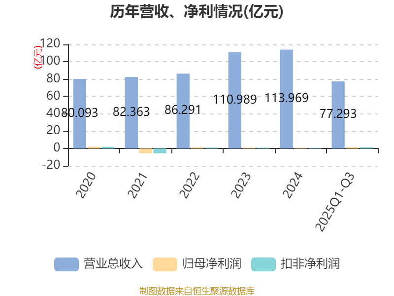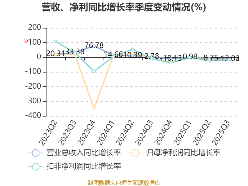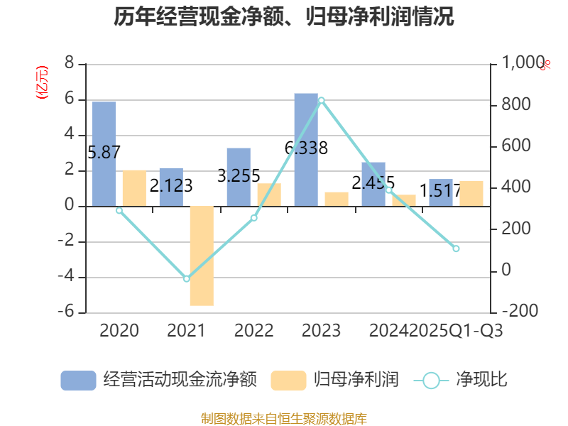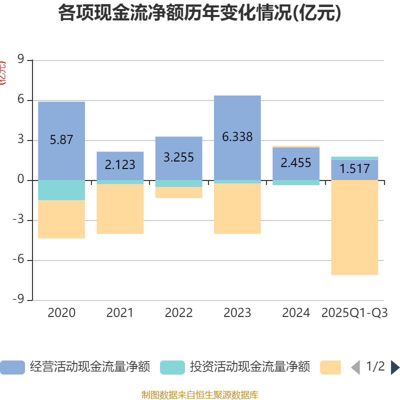 2025年前三季度,公司经营活动现金流净额为1.52亿元,同比下降28.23%;筹资活动现金流净额-7.13亿元,同比增加2.5亿元;投资活动现金流净额2315.3万元,上年同期为-2104.53万元。