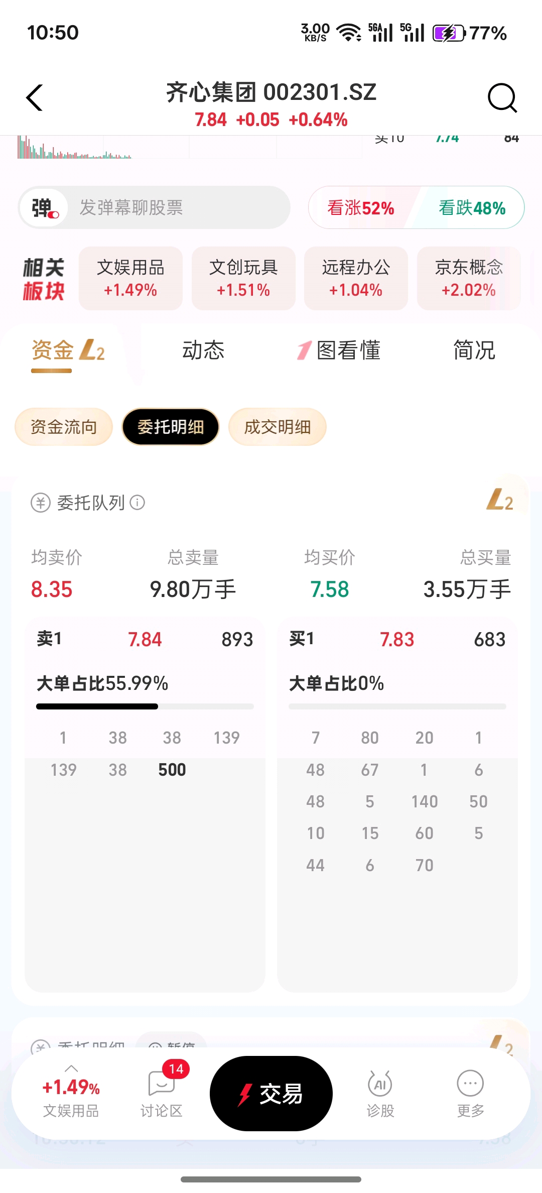 $齐心集团(SZ002301)$ 委托单上这种等量 小单基本也是主力出货,卖的都是主力 买的都是散户。所以应该会涨停板吧。