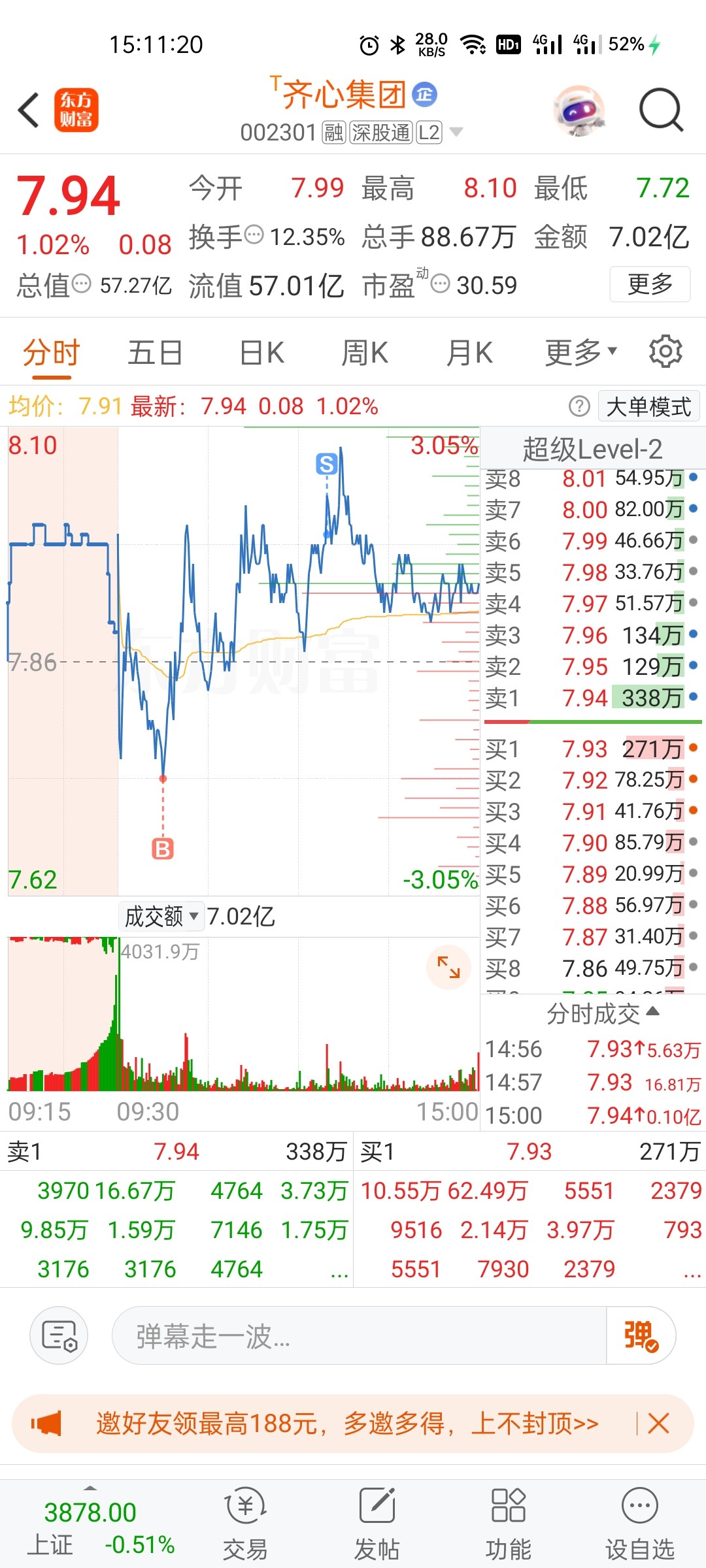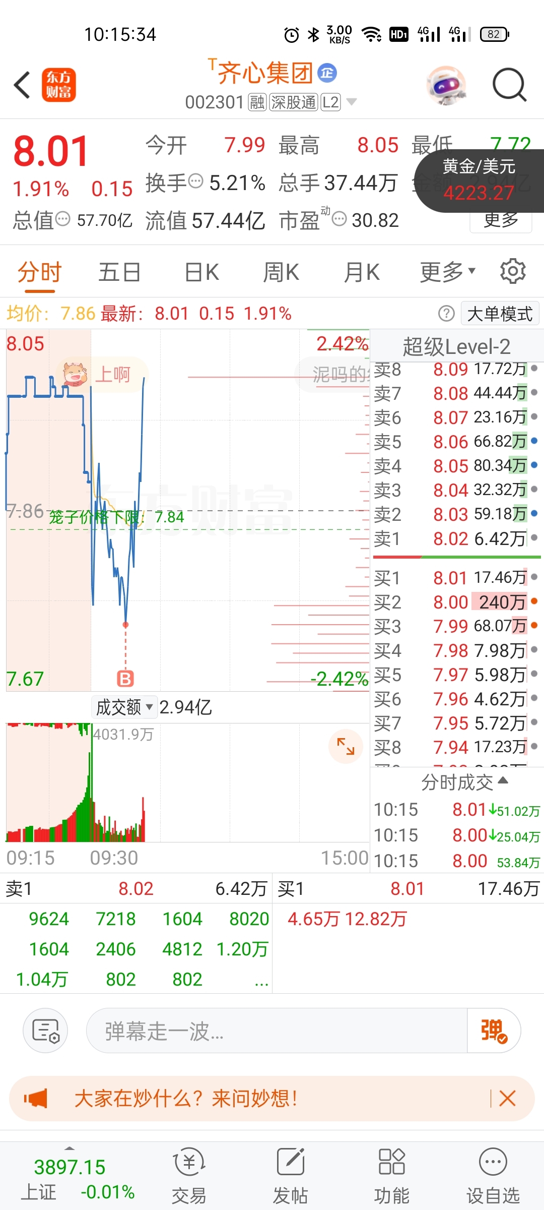 $齐心集团(SZ002301)$ 日内低点