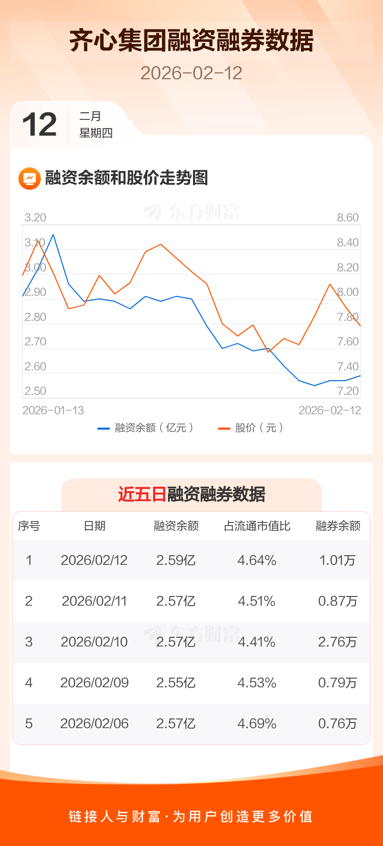 交易所最新数据显示,齐心集团于2026年2月12日获融资买入1795.77万元,融资偿还1579.99万元,当日融资净买入215.78万元。目前,该股融资余额2.59亿,占流通市值比例为4.64%。
