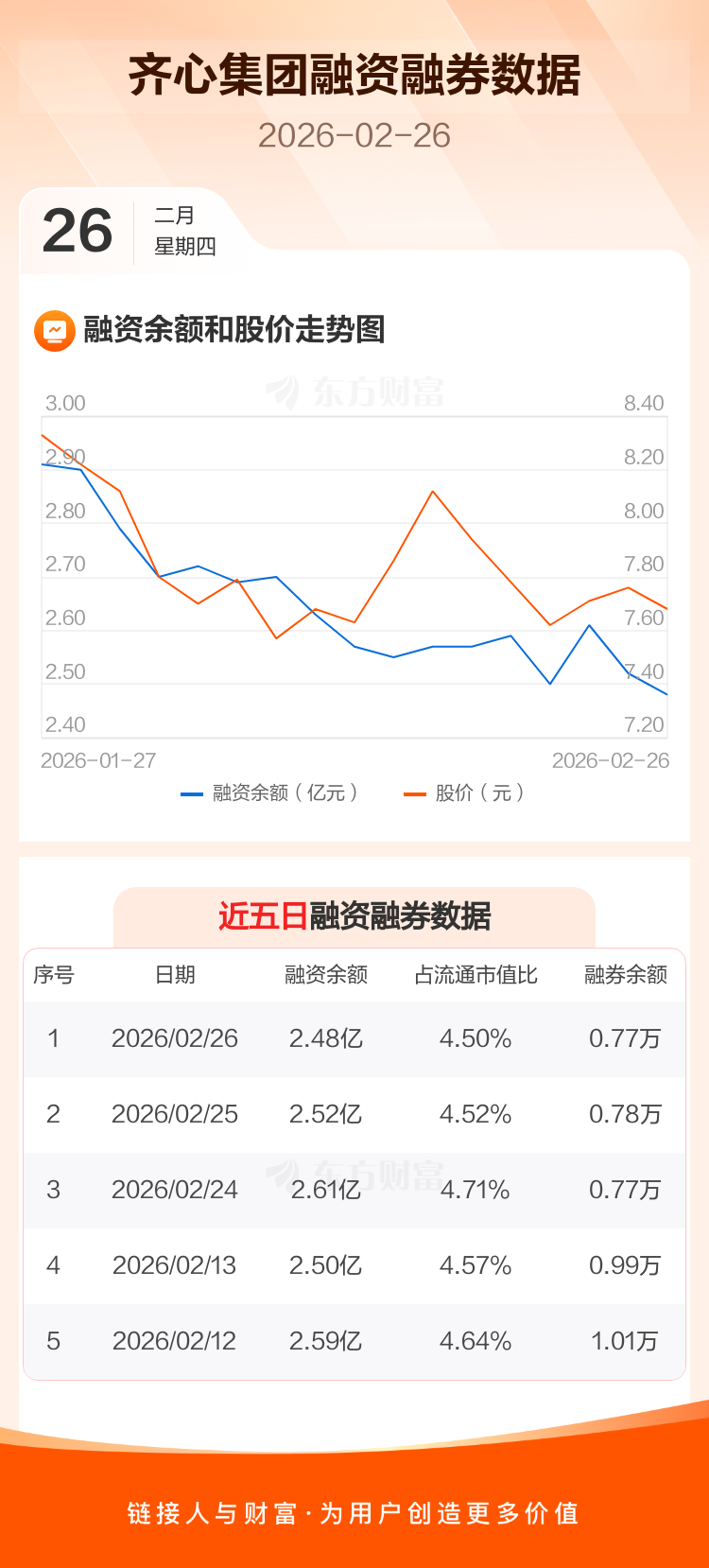 交易所最新数据显示,齐心集团于2026年2月26日获融资买入1461.60万元,融资偿还1854.42万元,当日融资净偿还392.82万元。目前,该股融资余额2.48亿,占流通市值比例为4.50%。
