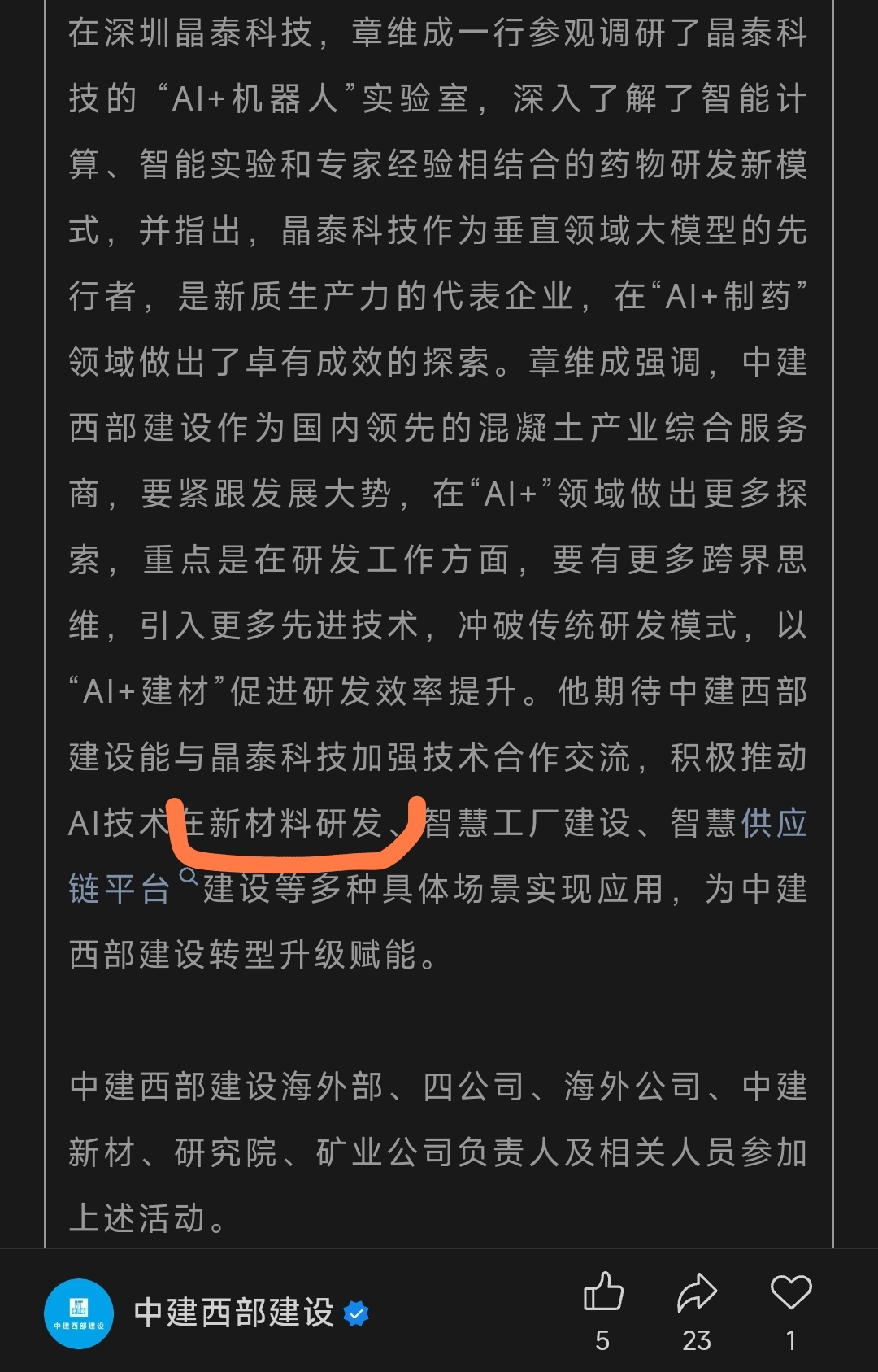 $西部建设(SZ002302)$ 西部建设与ai4s行业龙头晶泰科技合作研发新材料