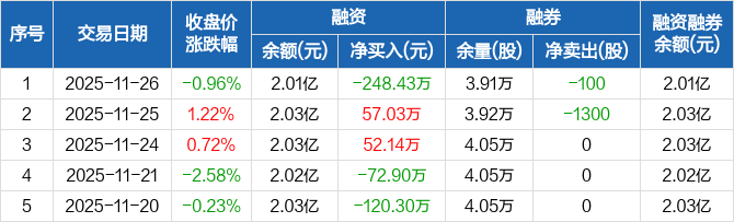 美盈森:融资净偿还248.43万元,融资余额2.01亿元(11-26)