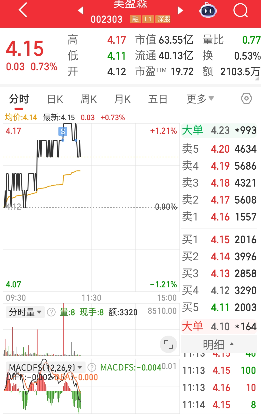 $美盈森(SZ002303)$ 上午券商宕机、时好时坏,交易系统卡死了开盘4.12挂单竟然没有买入,反着来、下午给机会再接回