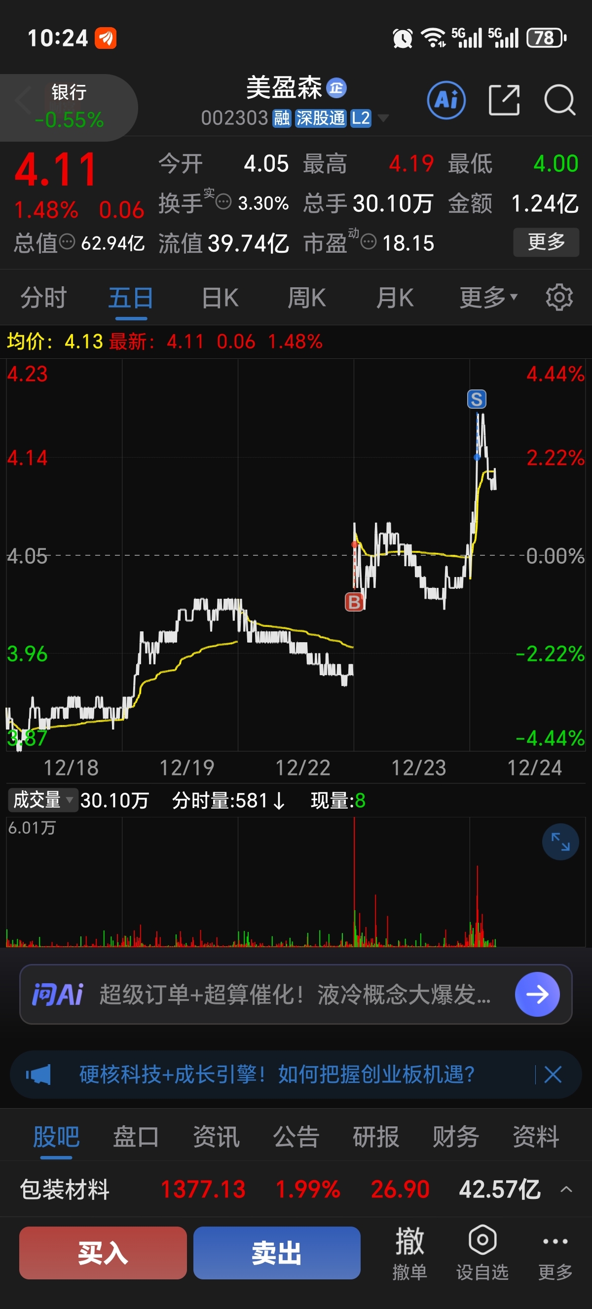 $美盈森(SZ002303)$ 我在马路边捡到一分钱,我把它交给警察叔叔说了声再见,