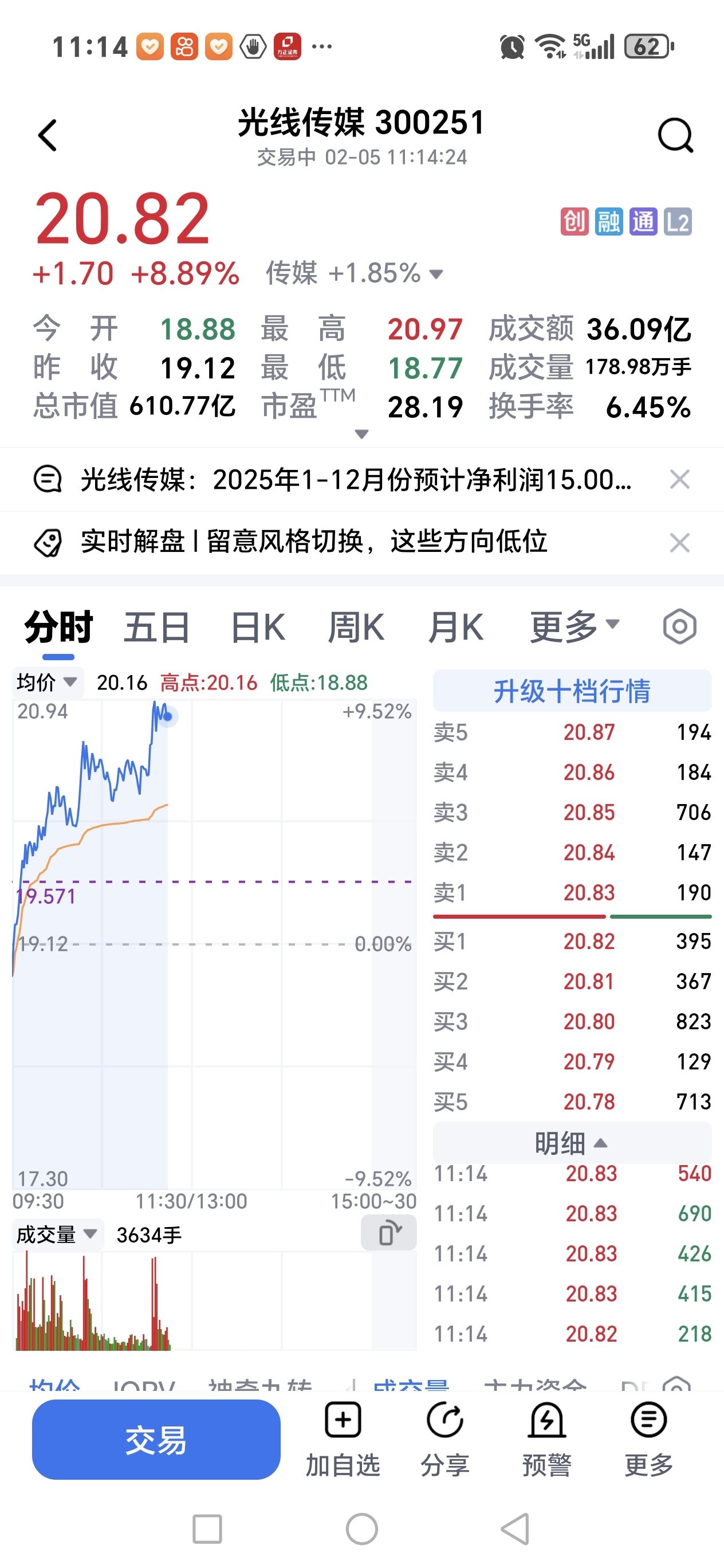 破飞船还在晒,美盈森好难涨的,昨天买入的光线传媒又大涨。