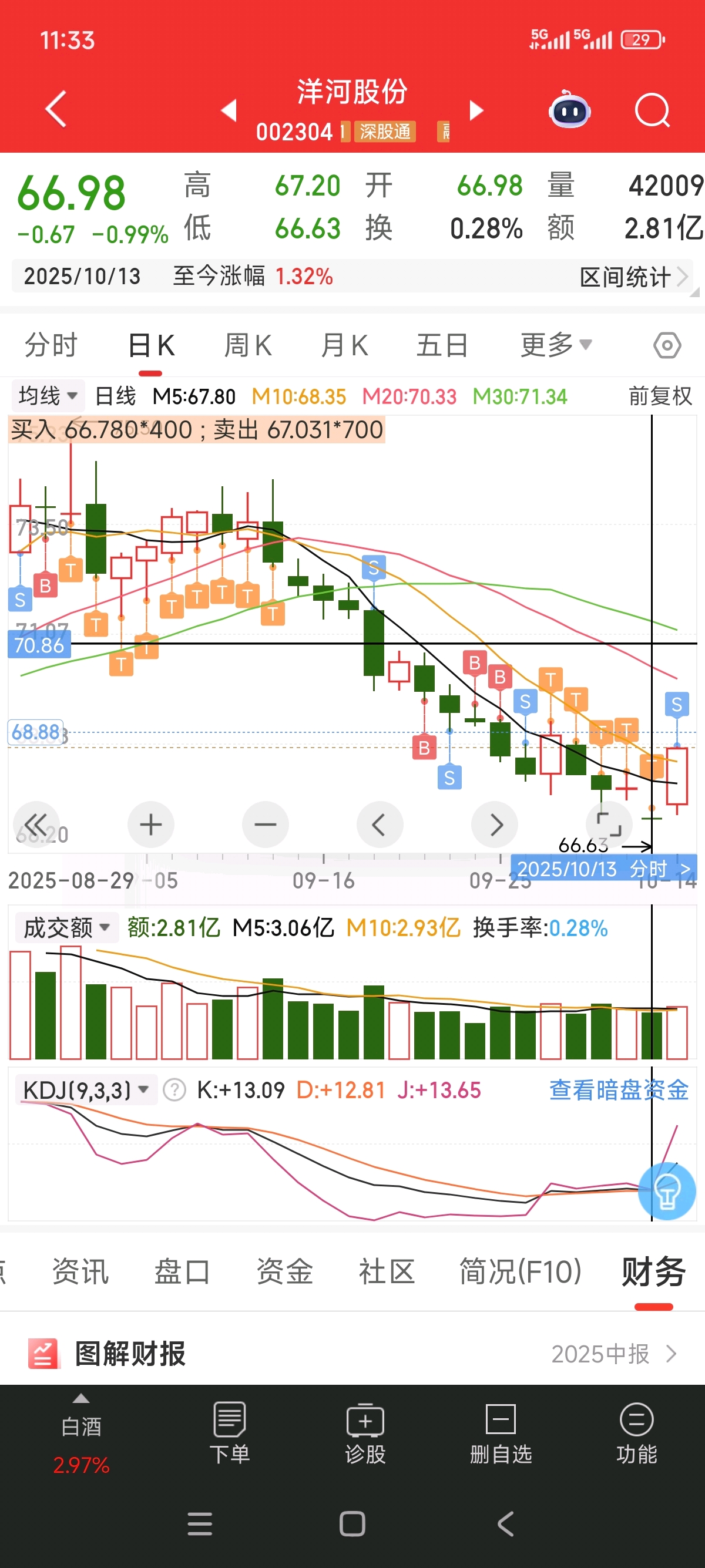 $洋河股份(SZ002304)$ 看来得我割肉呀,,昨天尾盘割300股,今天早上砸盘我就在割一部分,,结果……你们得感谢我,,,等我割肉清仓,洋河必上150