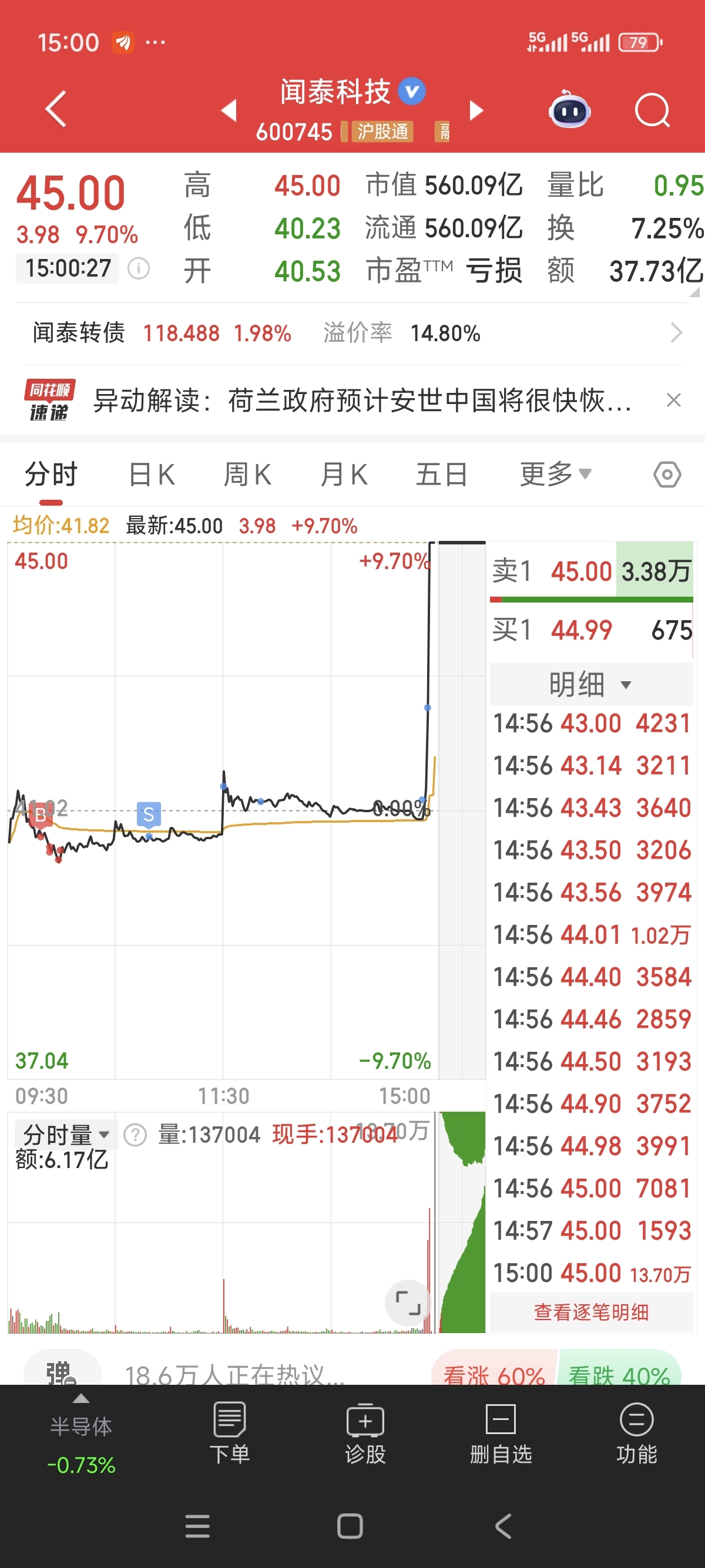 感谢闻泰,,最后3分钟直线拉起来,,虽然卖飞好几百股,,,但是很开心,,终于不用