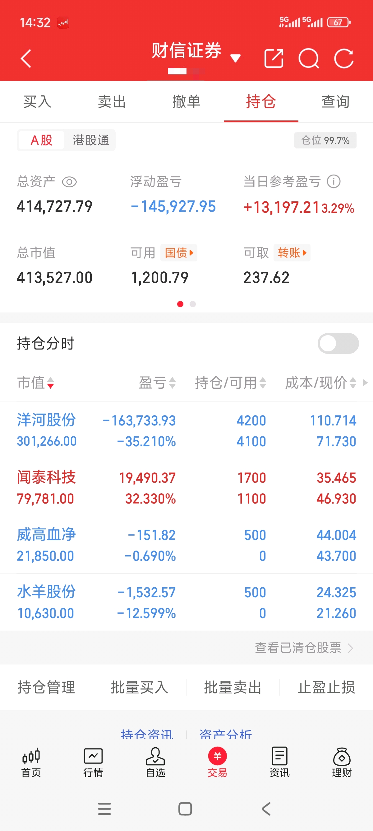 $洋河股份(SZ002304)$ $闻泰科技(SH600745)$ 今天舒服了,,时隔大半年,,第一次浮盈超1.3w,不容易呀,,快点收盘吧,,别砸就可以
