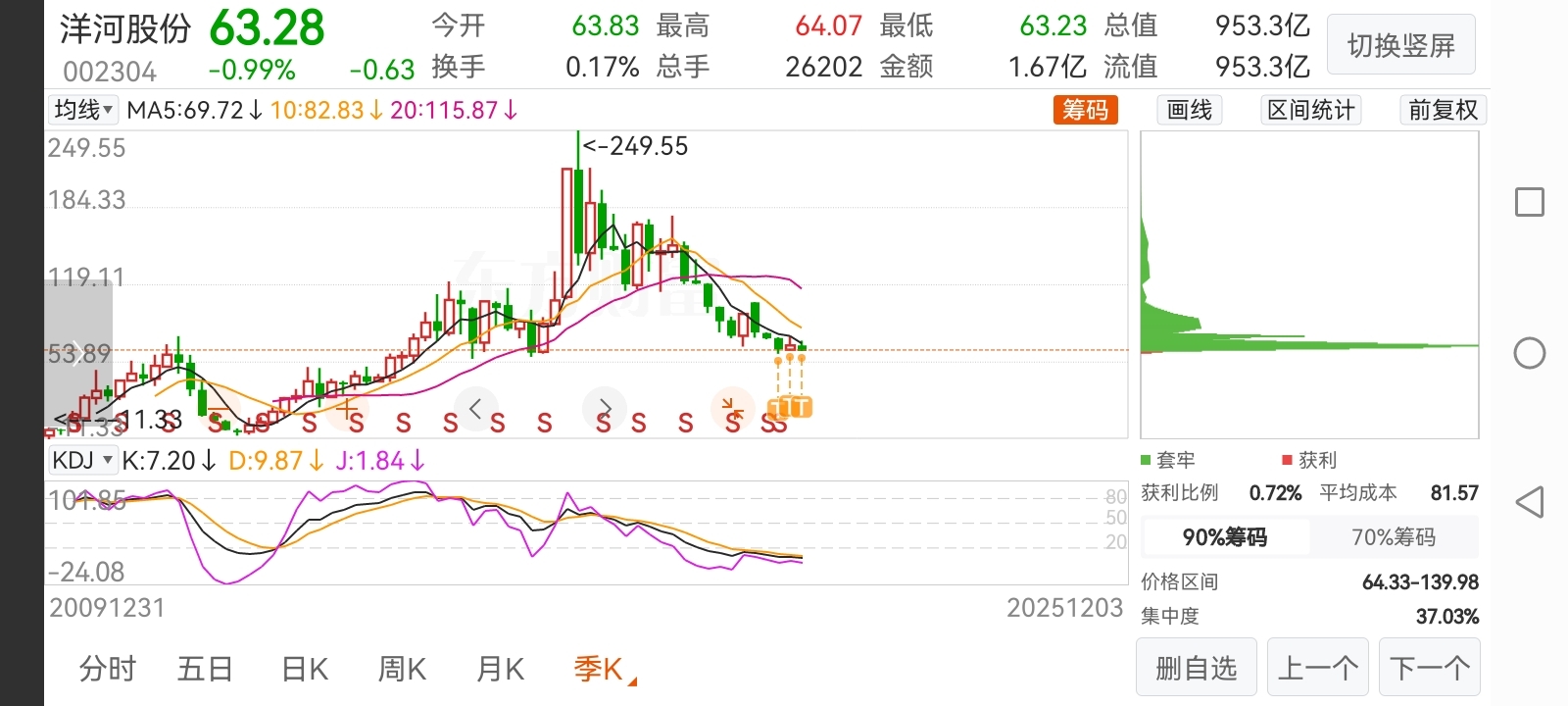 $洋河股份(SZ002304)$ 主力牛掰,到成本线了