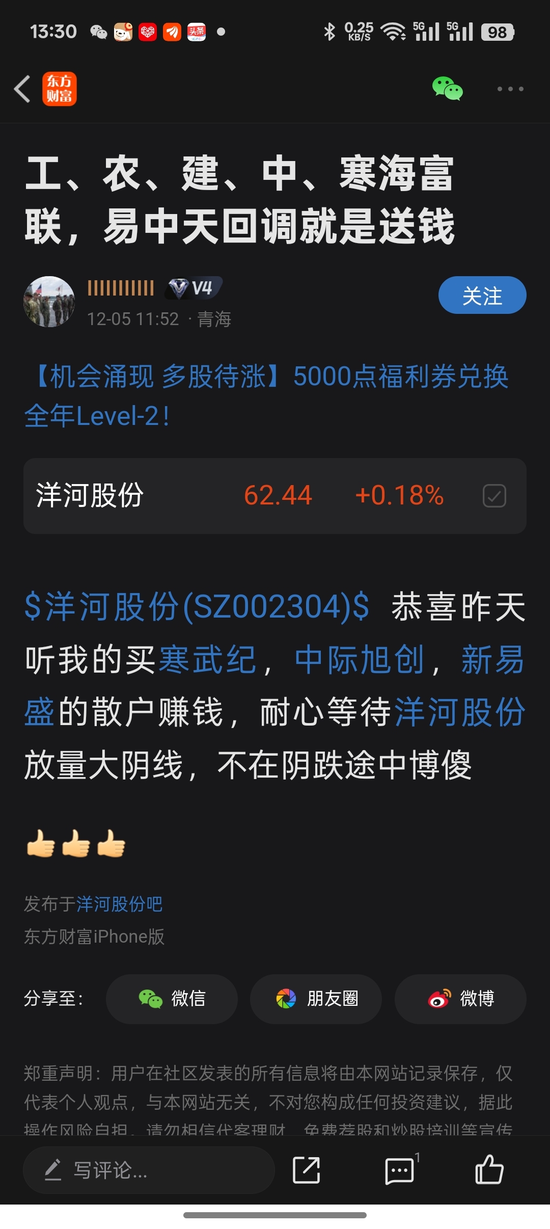 温馨提示: 1.根据《证券法》规定,禁止编造、传播虚假信息或者误导性信息,扰乱证券市场;2.用户在本社区发表的所有资料、言论等仅代表个人观点,与本网站立场无关,不对您构成任何投资建议。用户应基于自己的独立判断,自行决定证券投资并承担相应风险。《东方财富社区管理规定》