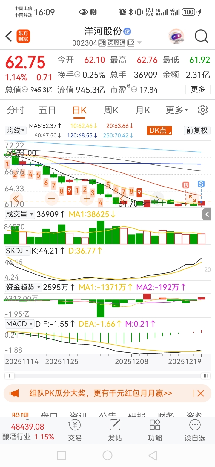 $洋河股份(SZ002304)$ 赚了一个快餐钱,拜拜嘞。