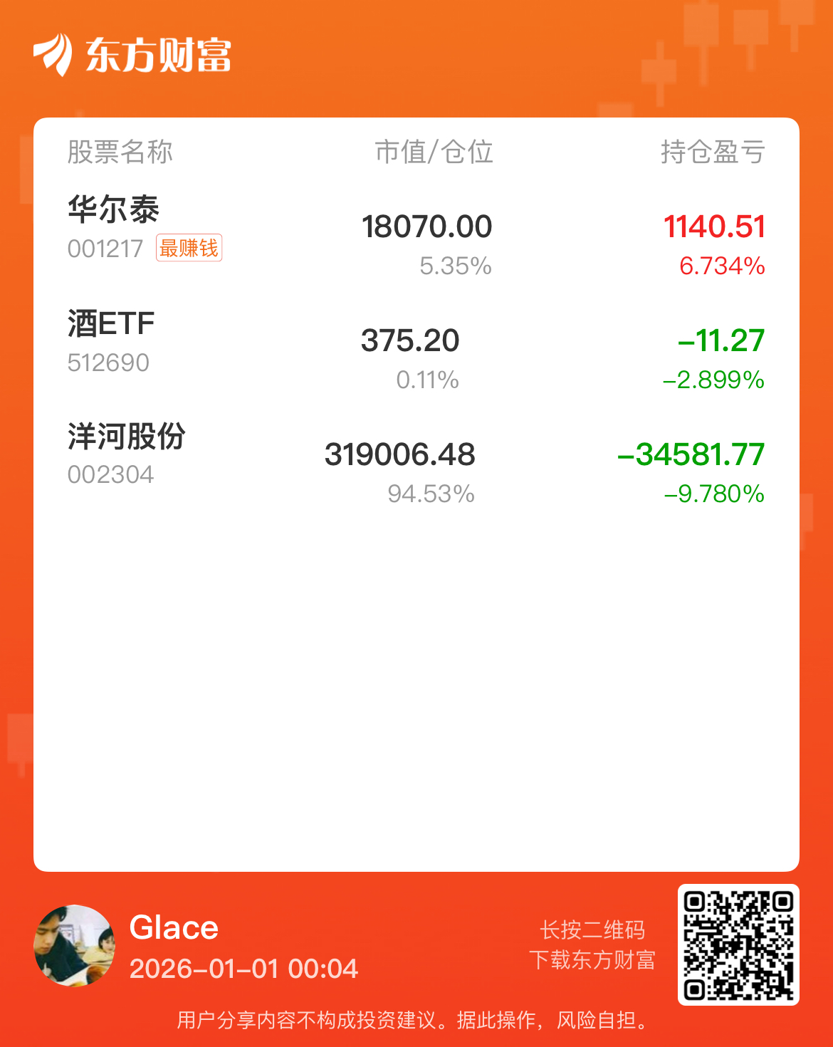 $洋河股份(SZ002304)$ 忘记2025年的混沌,祝洋河的兄弟家人们新年快乐,2026朝气美满$华尔泰(SZ001217)$