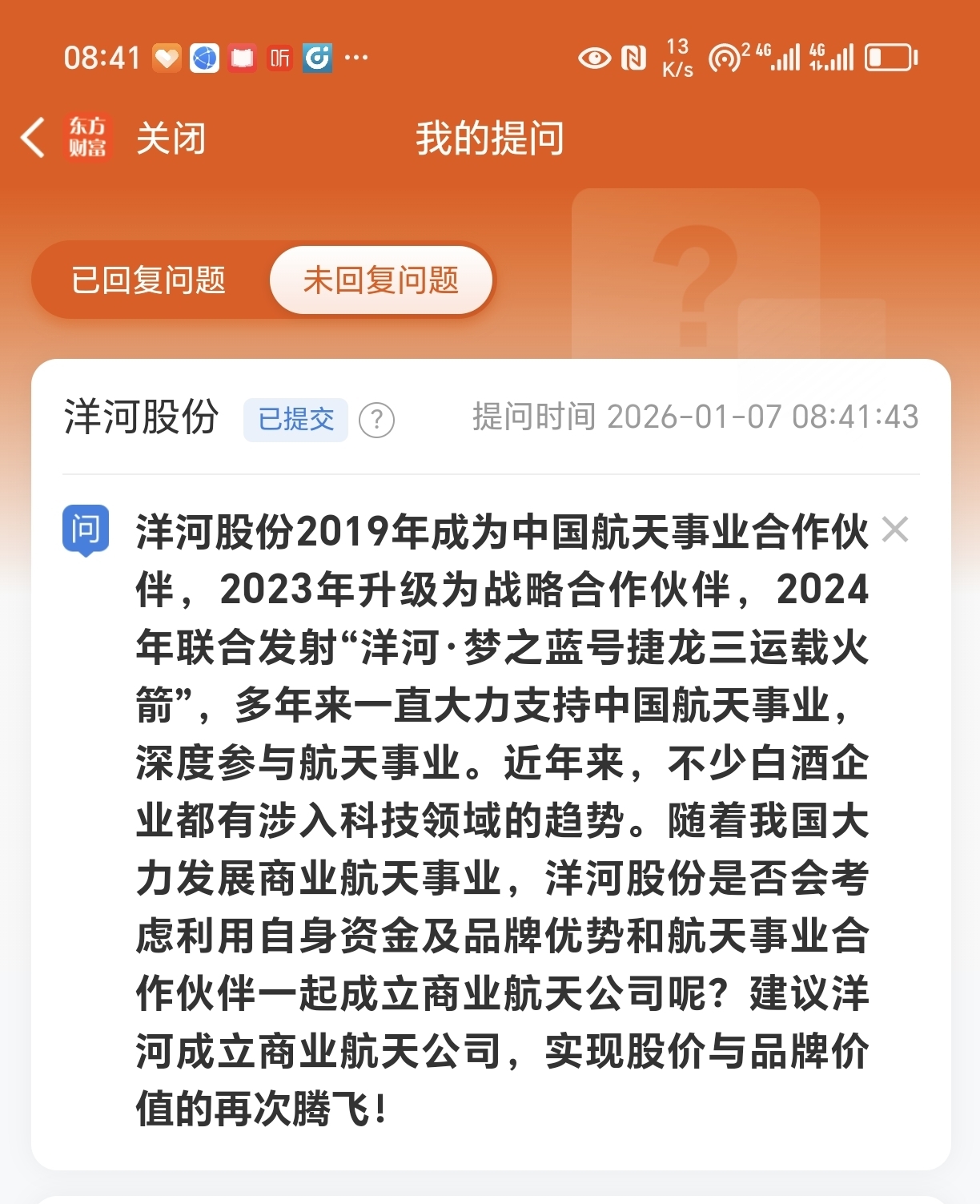 向董秘提出洋河股份成立商业航天公司的建议!