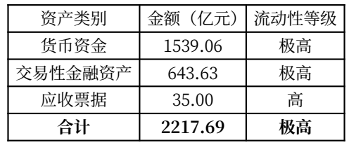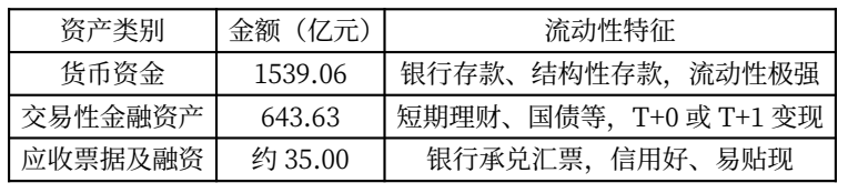 • 现金及类现金资产:2,217.69 亿元(货币资金 1,539.06 亿元 + 交易性金融资产 643.63 亿元 + 应收票据 35 亿元)