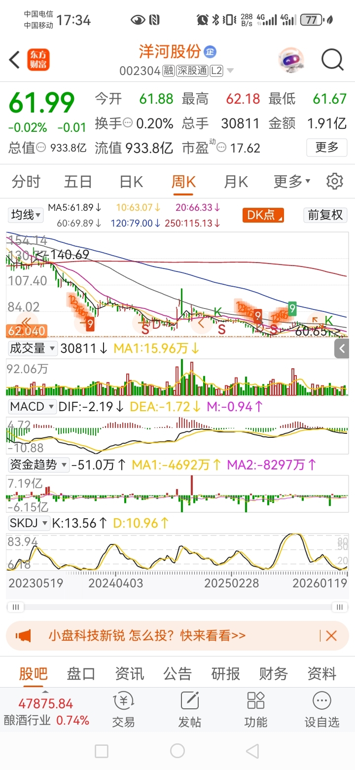 $洋河股份(SZ002304)$ 周线底背离,可以买一点玩玩。