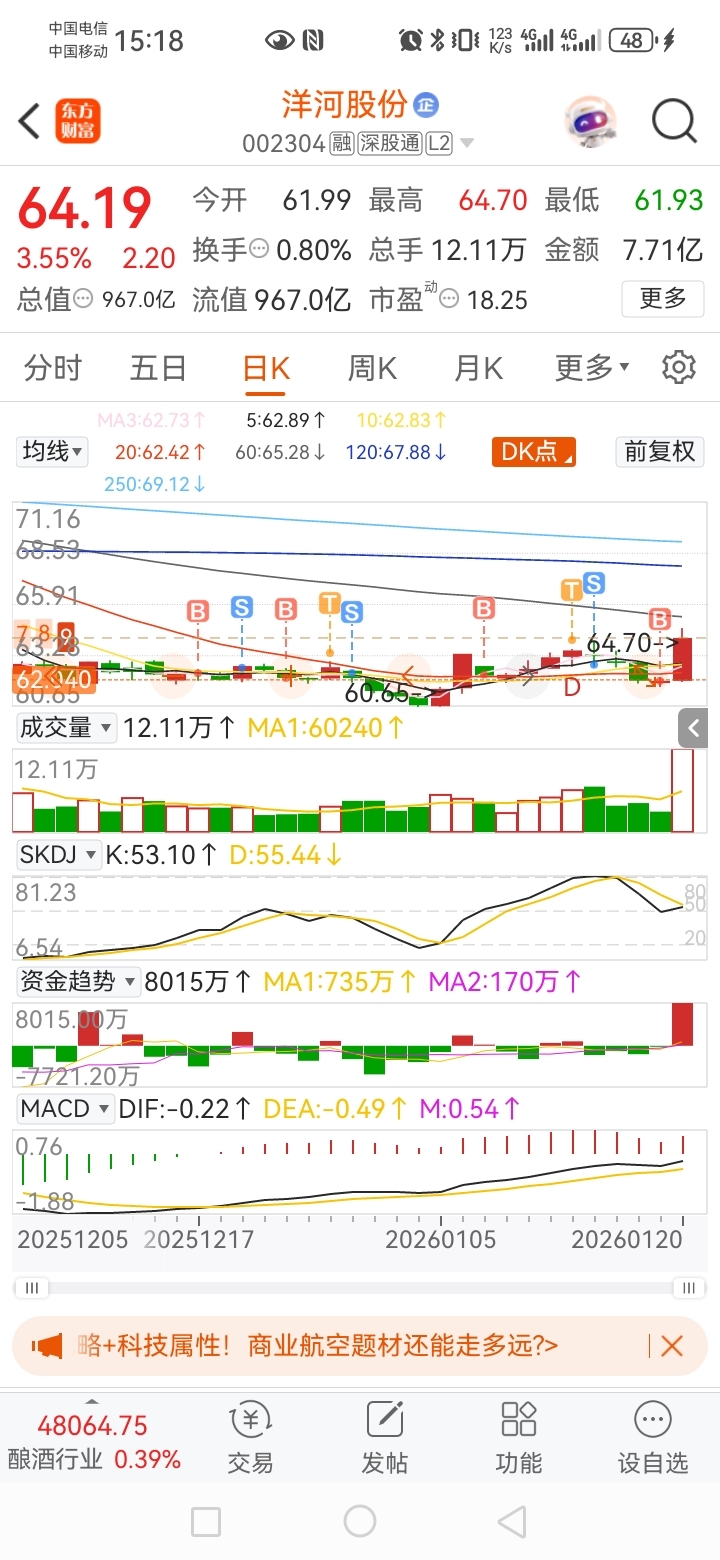 $洋河股份(SZ002304)$ 底部放量中阳线,回调就可以加仓。