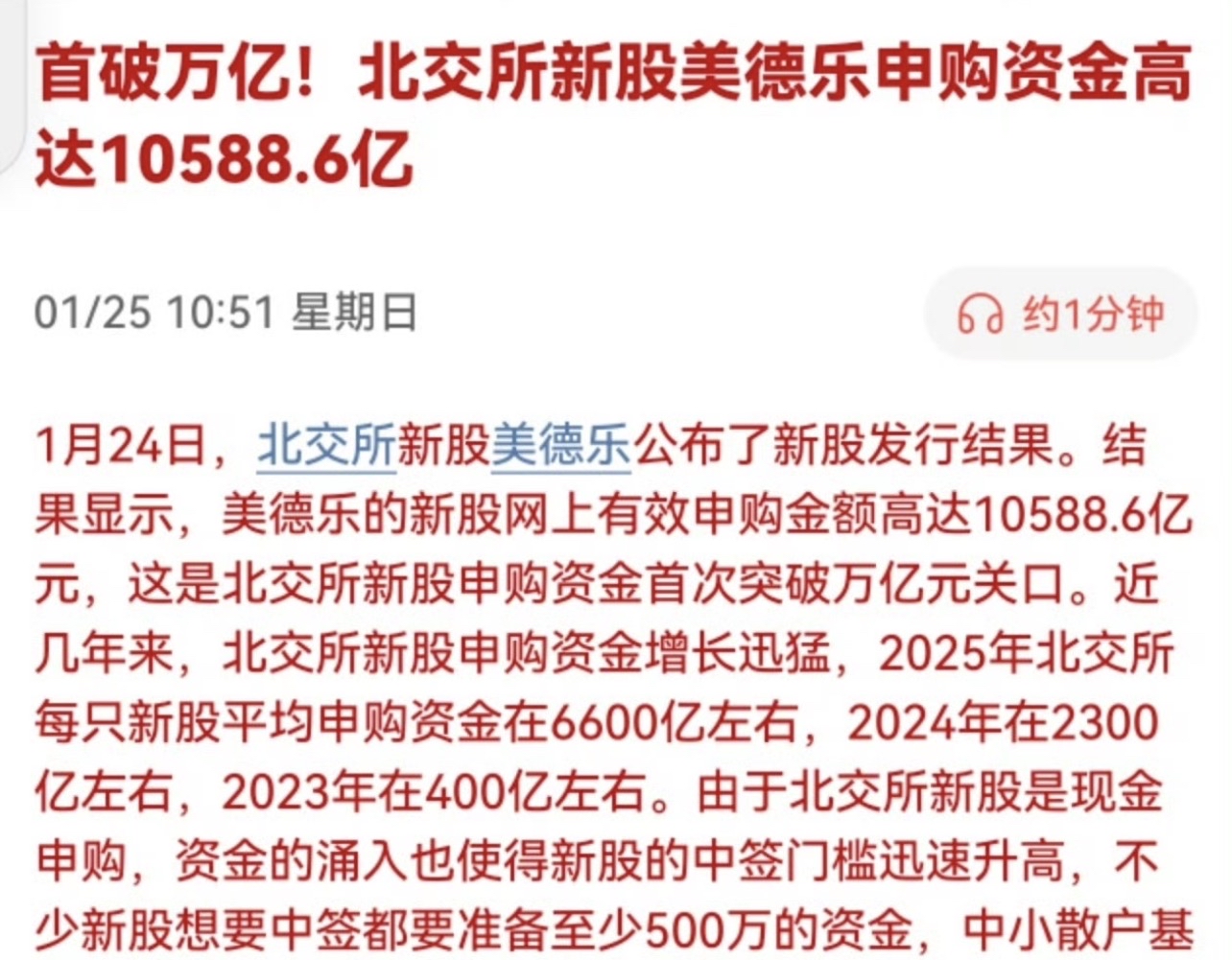 首破万亿!北交所新股美德乐申购资金高达10588.6亿。A股这个市场真不缺钱…只
